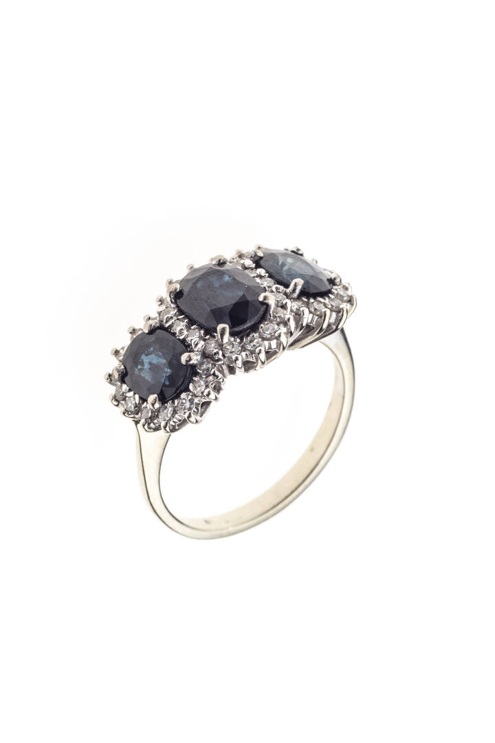 in oro bianco con tre zaffiri taglio ovale per totali ct 2,0 ca e diamanti taglio 8/8 per totali ct 0,25 ca