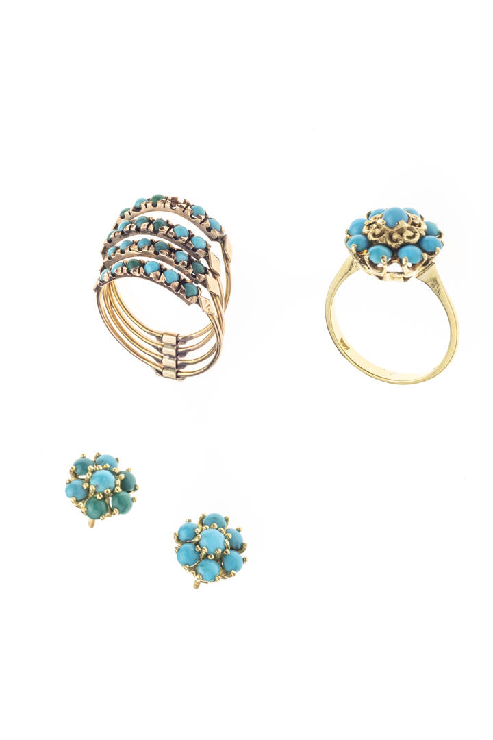 - demi-parure in oro giallo composta da coppia di orecchini ed anello con sfere di turchesi. Peso gr 8,2 Misura 13 (54)