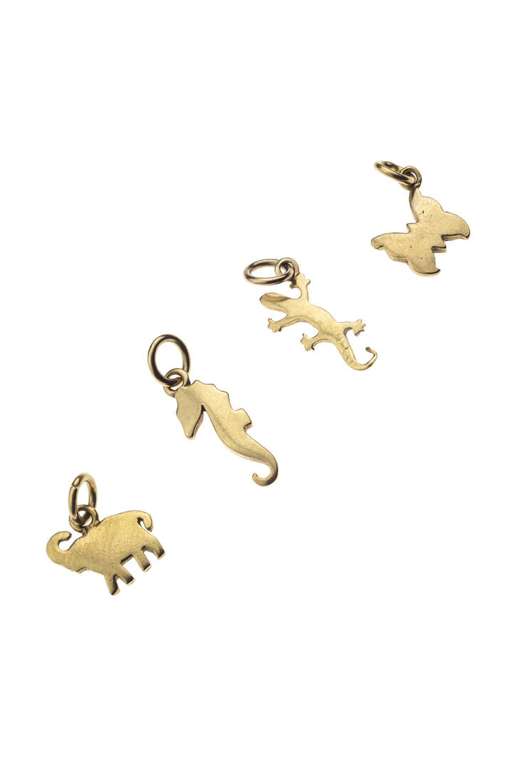 Lotto di quattro ciondoli firmati "Pomellato", linea "Dodo" raffiguranti un elefante, una farfalla, un geco ed un cavalluccio marino