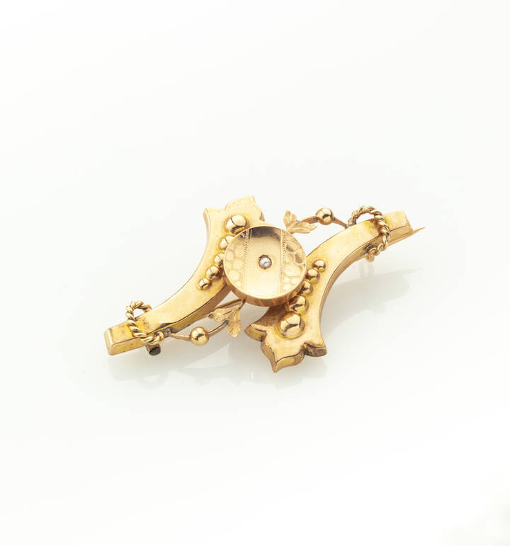 in oro giallo a bassa caratura, XIX secolo, di forma geometrica, lavorata a canna vuota, con decori vegetali e perlina centrale