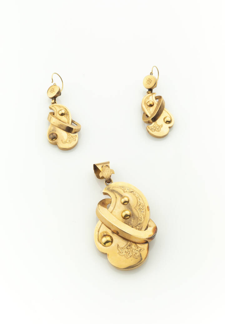 in oro giallo a bassa caratura, composta da coppia di orecchini pendenti e ciondolo di forma fantasia, epoca XIX secolo