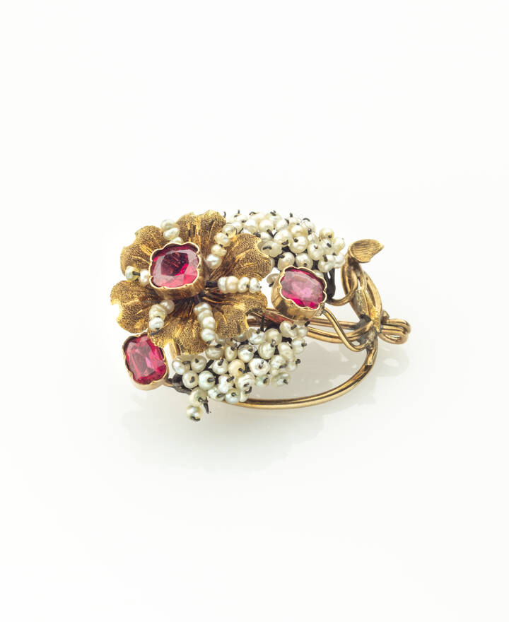 in oro a bassa caratura, a forma di fiore, con perline a decoro e gemme rosse sintetiche
