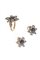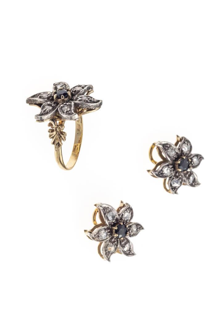 in oro giallo ed argento, composta da coppia di orecchini, a clip, ed anello a forma di fiore con zaffiri taglio rotondo per totali ct 0,90 ca e rosette di diamanti per totali ct 0,80 ca