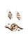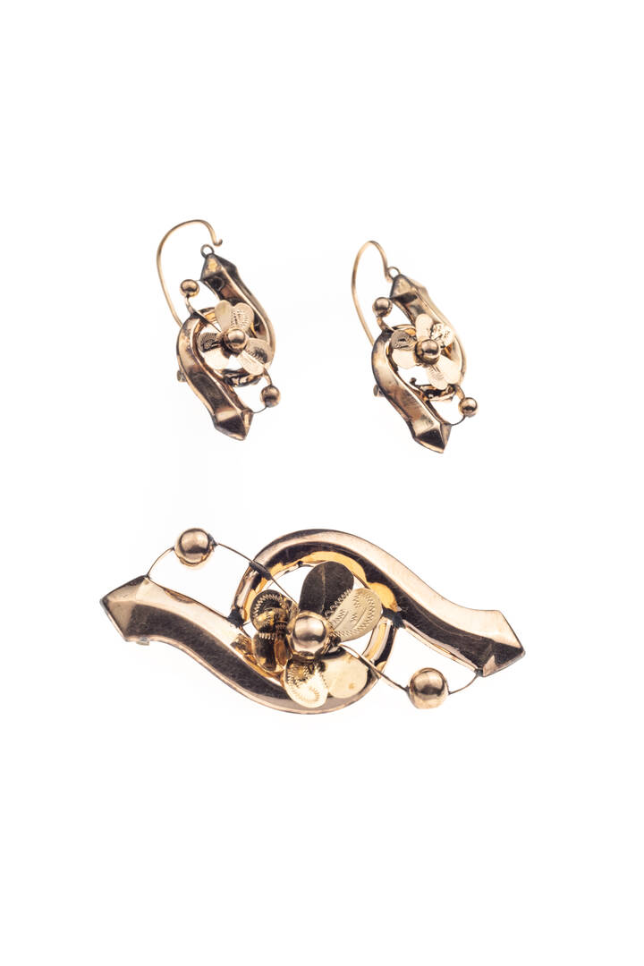 in oro rosa, a bassa caratura, composta da coppia di orecchini a monachella e spilla (ago mancante), XIX secolo
