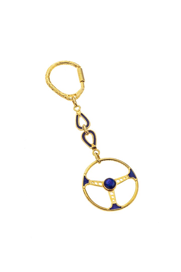 in oro giallo, decorato con smalti blu, terminante con ciondolo a forma di volante