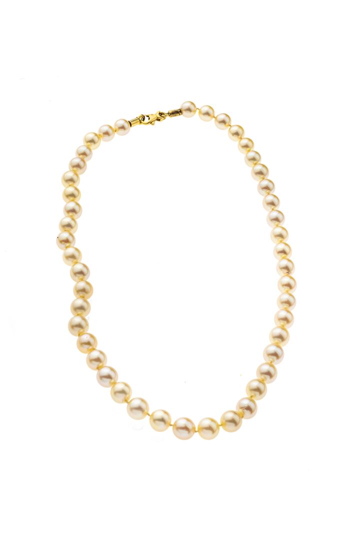 composto da un filo di perle giapponesi del diam di mm 8 e 7,5 ca. Chiusura, a moschettone, in oro giallo