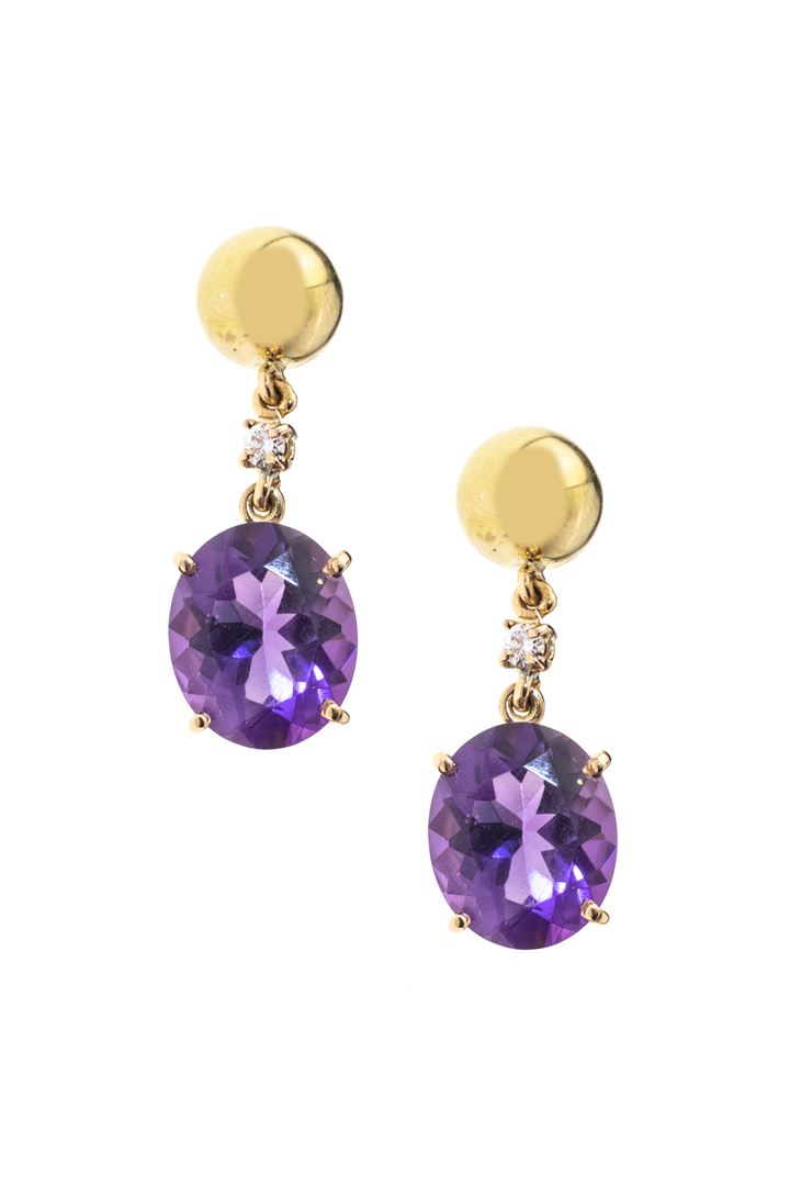 in oro giallo, semisfere ai lobi, due diamanti taglio brillante per totali ct 0,04 ca, terminanti con due ametiste taglio ovale