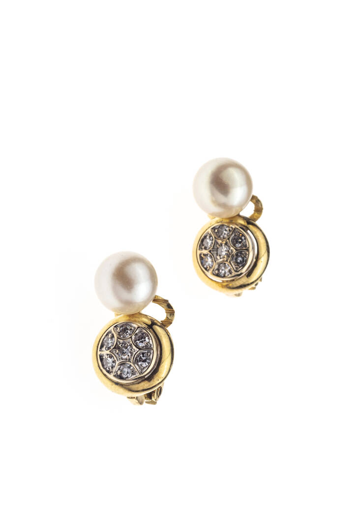 in oro giallo e bianco, con diamanti taglio 8/8 per totali ct 0,15 ca e due perline del diam di mm 7,5