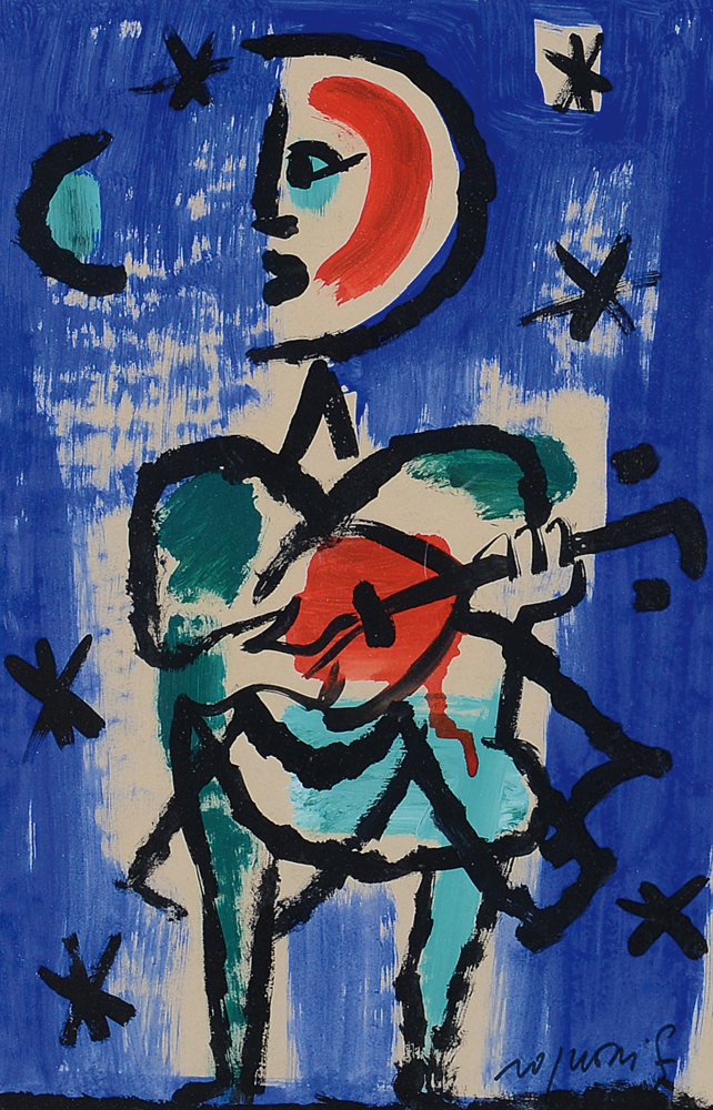FRANCO ROGNONI Milano 20/09/1913 - Milano 11/03/1999 Suonatore notturno tecnica mista su cartoncino applicato su tela cm. 48x31, firma in basso a destra, autentica dell'artista su foto, conferma d'autenticità a cura di Mariuccia Noè Rognoni su foto.
