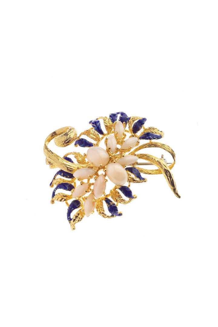 in oro giallo, anni '50, con corallo rosa taglio ovale e navette cabochon e smalto blu