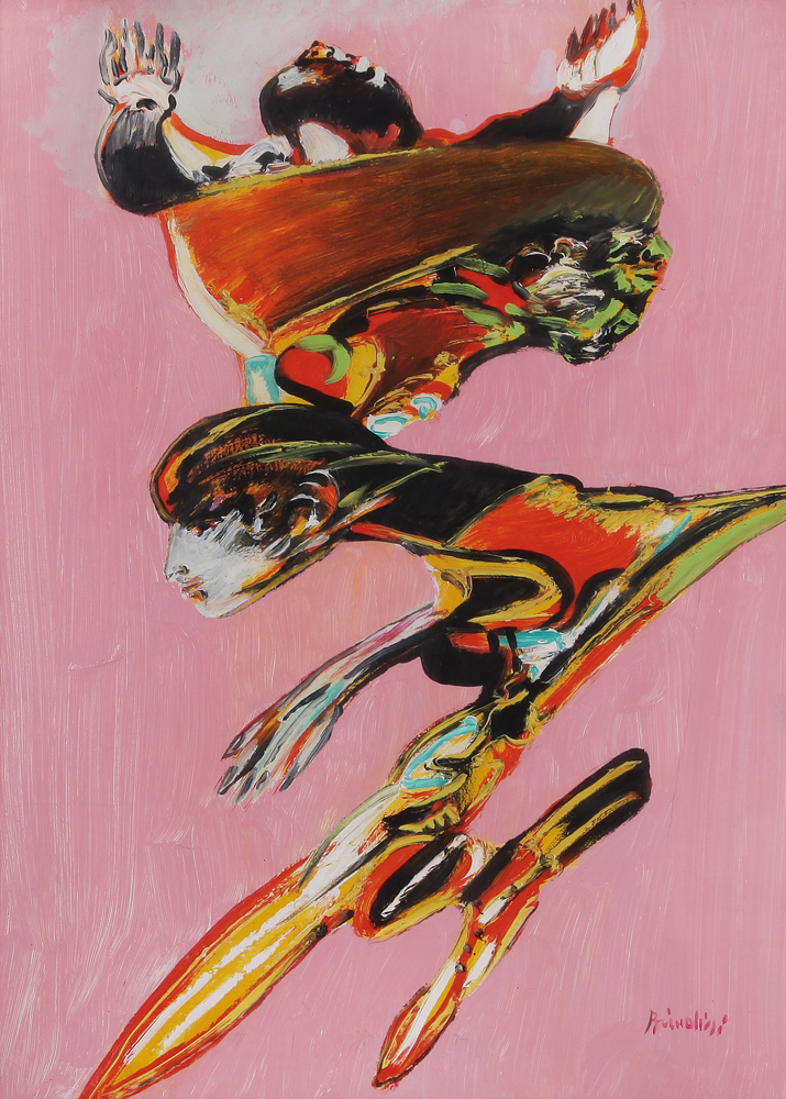 REMO BRINDISI Roma 25/04/1918 - Milano 25/07/1996 Reazioni olio su tela cm. 70x50, firma in basso a destra, firma, dedica ad personam e timbro della Galleria d'Arte Il Vertice (MI) al retro, archivio delle opere di Remo Brindisi a cura della "Galleria Pace" (MI) su foto.