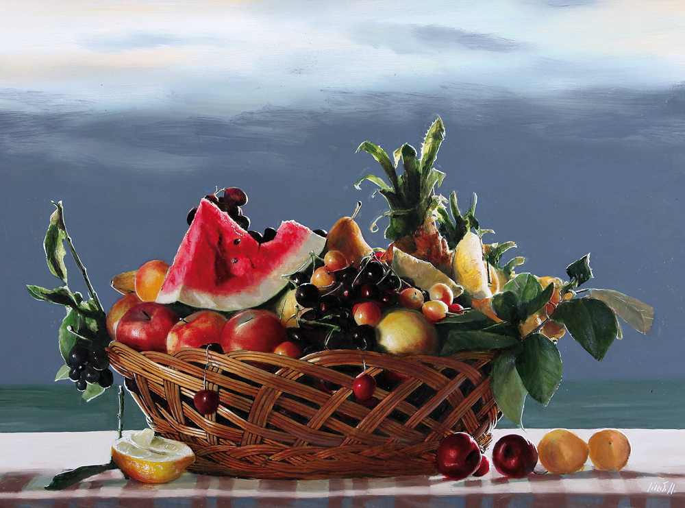BENIAMINO CICCOTELLI Tollo 1937  Cesto con ananas olio su tela cm. 60x80, firma in basso a destra, titolo e firma al retro, dichiarazione d'autenticità dell'artista su foto.