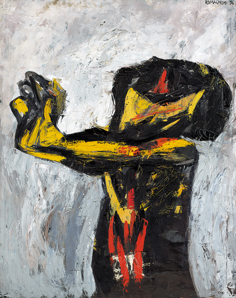 BEPI ROMAGNONI Milano 21/11/1930 - Villasimius (Ca) 19/07/1964 Fucilato, 1956 olio su tela cm. 99x80, firma e anno in alto a destra, titolo, firma e anno al retro, pubblicato sul catalogo della mostra "Milano 1956-1966: dal Realismo al Realismo esistenziale", a cura di Enzo Fabiani e Claudio Malberti, tenutasi presso la Galleria Marieschi (Monza) nel settembre 1997, alla tavola 13.