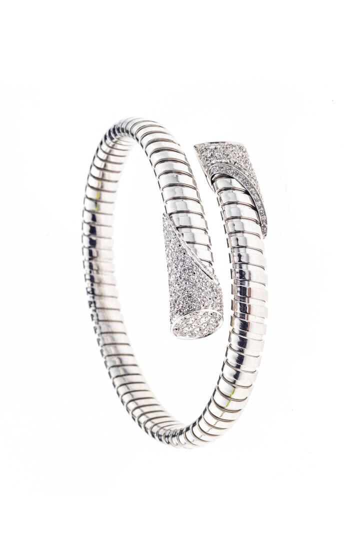 in oro bianco, lavorato a maglia tubogas, con terminali geometrici in pavé di diamanti per totali ct 1,29, probabile colore G-H, purezza IF-VVS