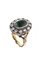 in oro a bassa caratura ed argento, sommità a margherita ovalizzata con smeraldo cabochon di ct 5,0 ca e contorno di diamanti taglio vecchio per totali ct 1,50 ca