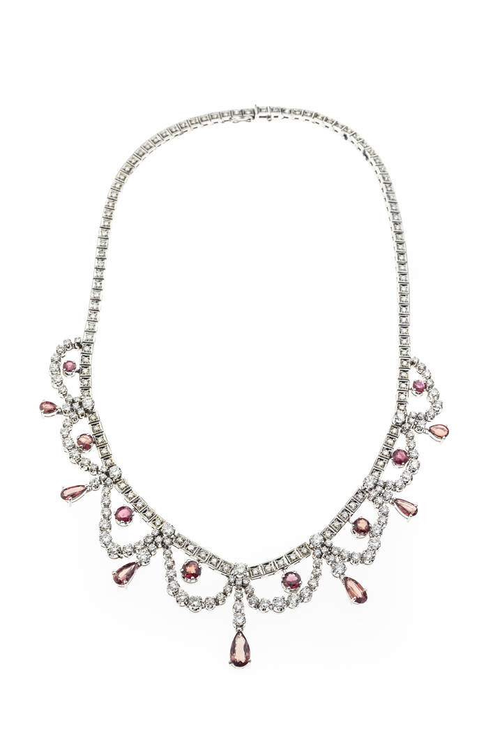in oro bianco, modello tennis, con al centro volute in diamanti taglio 8/8 e brillante per totali ct 6,50 ca con gocce e tondi di rodoliti