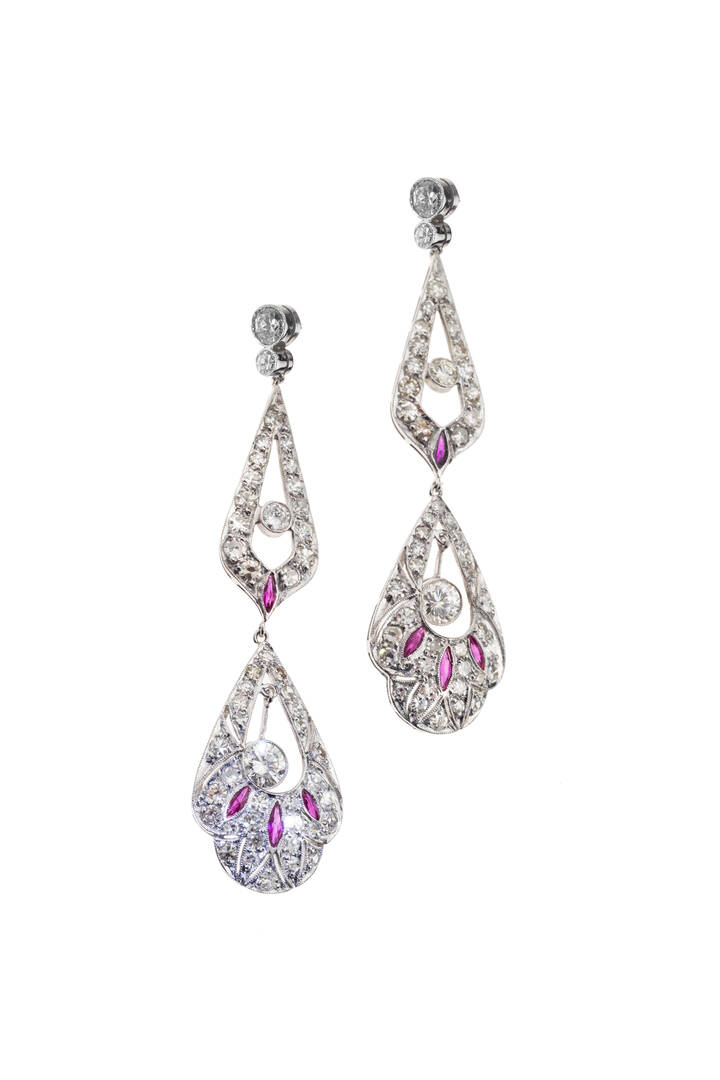 pendenti, in oro bianco con diamanti taglio 8/8 e brillante per totali ct 2,10 ca e rubini taglio navette a decoro per totali ct 0,30 ca