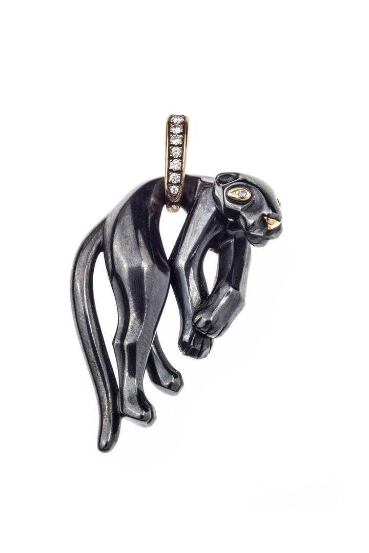 Ciondolo in argento brunito, firmato Cartier, a forma di pantera. Occhiello in oro rosa con diamanti taglio brillante per totali ct 0,10 ca