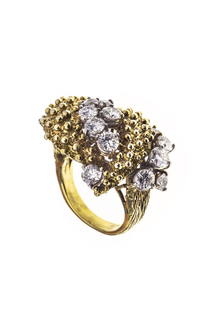 in oro giallo, sommità con due fasce lavorate a riccio, alternate a diamanti taglio brillante per totali ct 2,50 ca