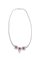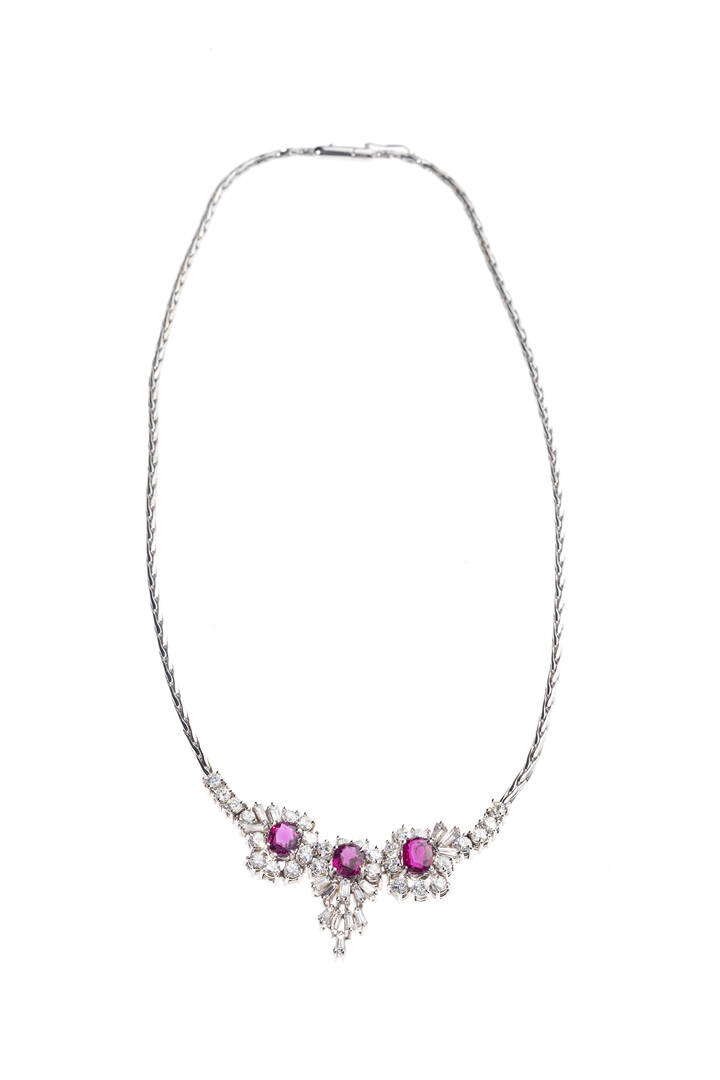 in oro bianco, maglia a coda di topo, al centro tre rubini taglio ovale per totali ct 4,20 ca e diamanti taglio brillante e trapezio per totali ct 2,50 ca.