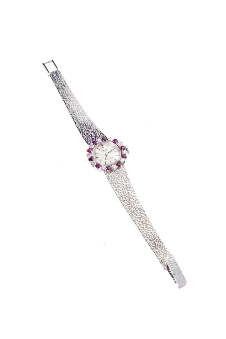Cassa in oro bianco con lunetta in diamanti taglio brillante per totali ct 1,0 ca, probabile colore G-H purezza IF-VVS, alternati a rubini taglio rotondo per totali ct 1,30 ca. Peso gr 32,6. Movimento a carica manuale