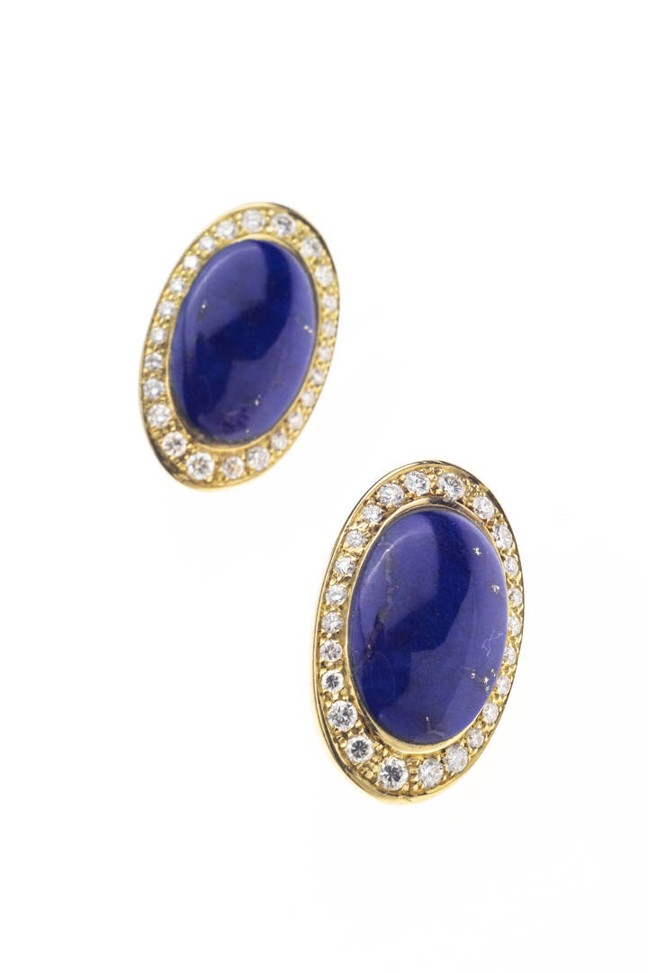 in oro giallo, di forma ovale, con lapislazzuli centrali taglio ovale cabochon ne contorno di diamanti taglio brillante per totali ct 1,15 ca, probabile colore G-H, purezza IF-VVS