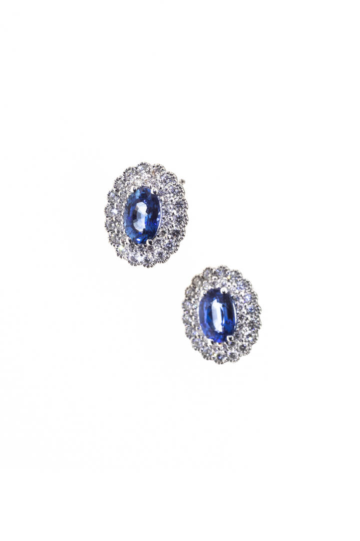 in oro bianco, a lobo, con due zaffiri taglio ovale per totali ct 0,56 ca e doppio contorno di diamanti per totali ct 0,56 ca, probabile colore G-H, purezza IF-VVS