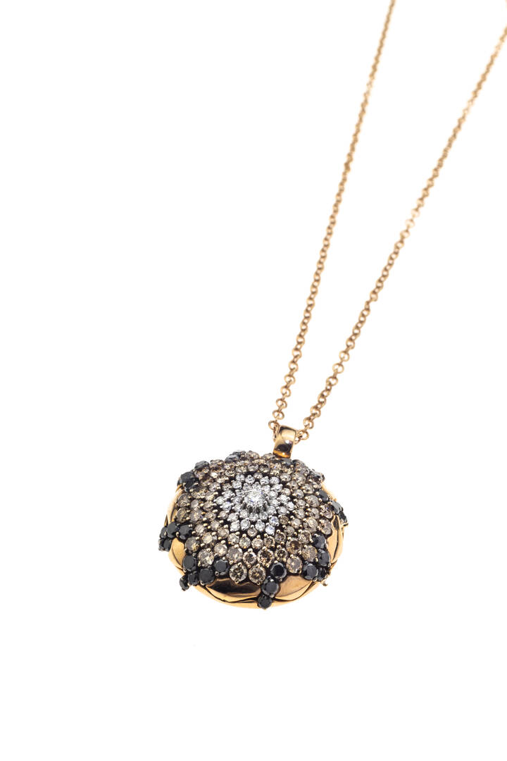 in oro rosa, di forma rotonda, con diamanti taglio brillante di colore bianco, nero e brown per totali ct 3,57 ca