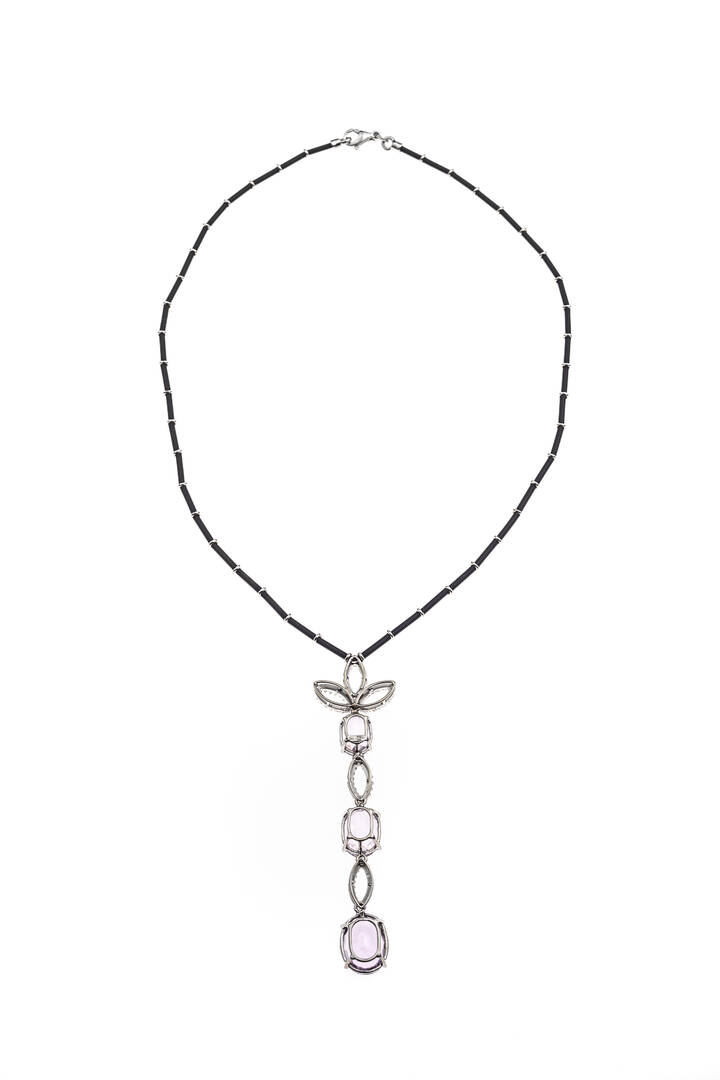 composta da maglie elastiche metalliche (parte interna), rivestite da maglie elastiche in oro smaltate nei toni del nero; ciondolo in oro bianco con tre Kunziti taglio ovale per totali ct 10,36 ca e diamanti taglio brillante per totali ct 0,40 ca