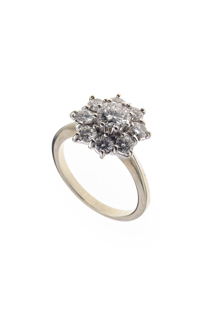 in oro bianco, sommità a margherita, con diamanti taglio brillante per totali ct di ct 1,40, probabile colore G-H, purezza S1