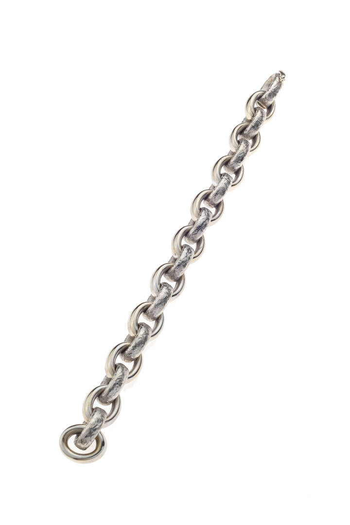 in oro bianco, composto da anelli bombati ovalizzati lucidi e satinati