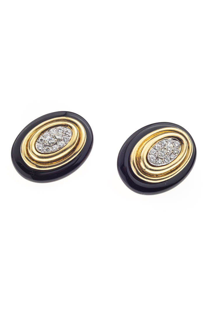 in oro giallo, a clip, di forma ovale con bordo esterno in onice e parte centrale con pavé di diamanti taglio brillante per totali ct 1,0 ca, probabile colore G-H, purezza IF-VVS