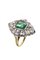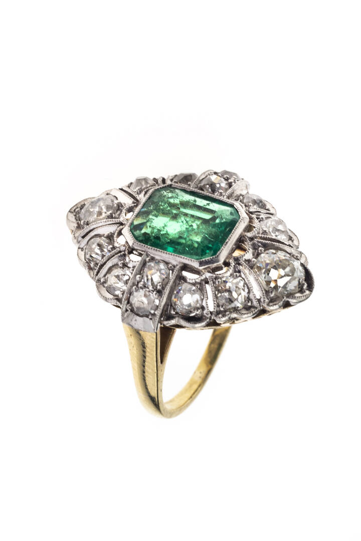 in oro giallo, sommità a losanga, 1920 circa, con smeraldo centrale taglio ottagonale a gradini e diamanti taglio brillante di vecchio taglio per totali ct 2,0 ca