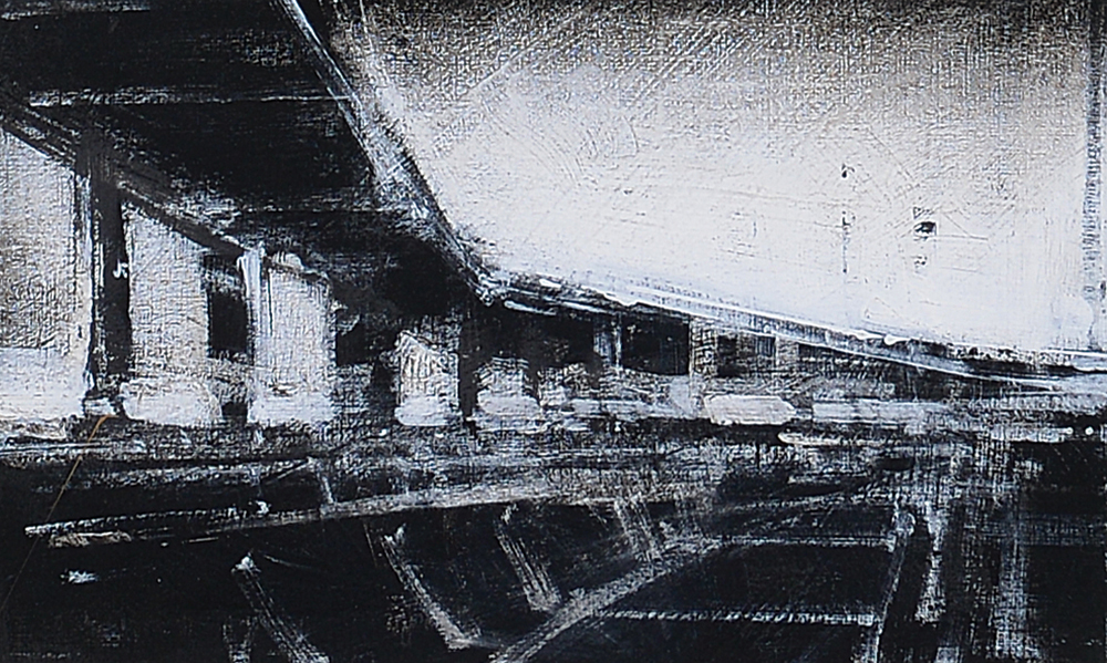 JONATHAN GUAITAMACCHI Londra 1961 N° 5 dopo il ponte, 2001 tecnica mista su carta intelata cm. 18x30, firma, titolo e anno al retro, dichiarazione d'autenticità dell'artista su foto.