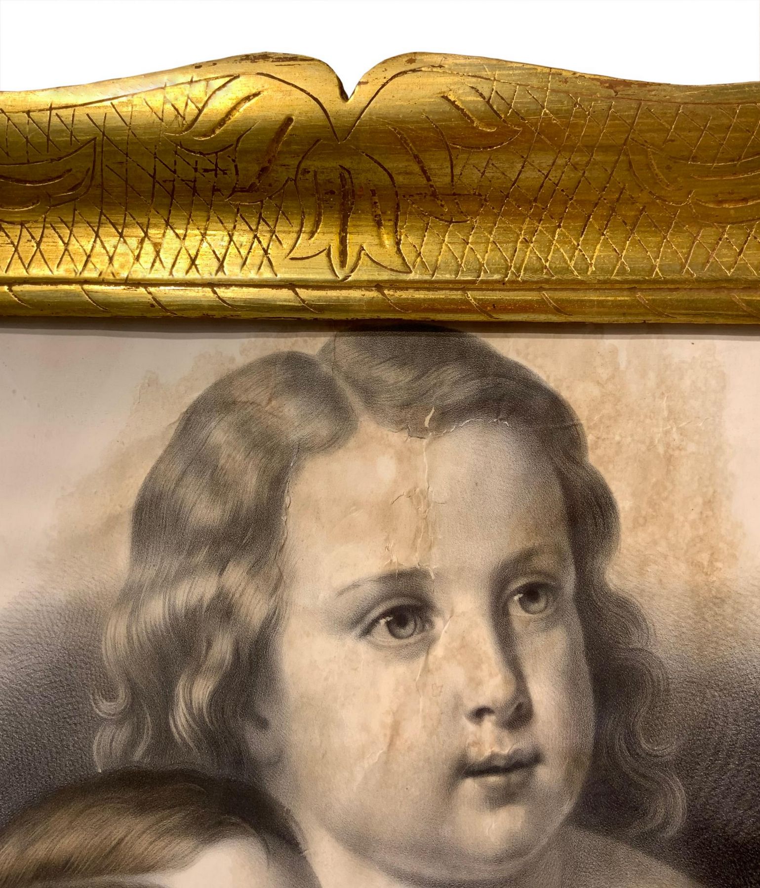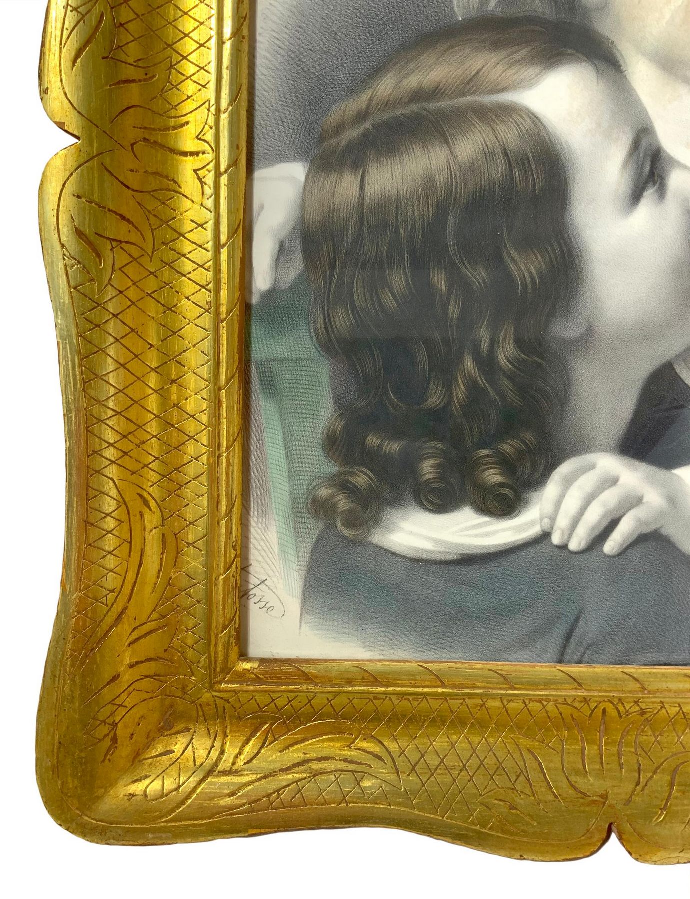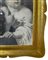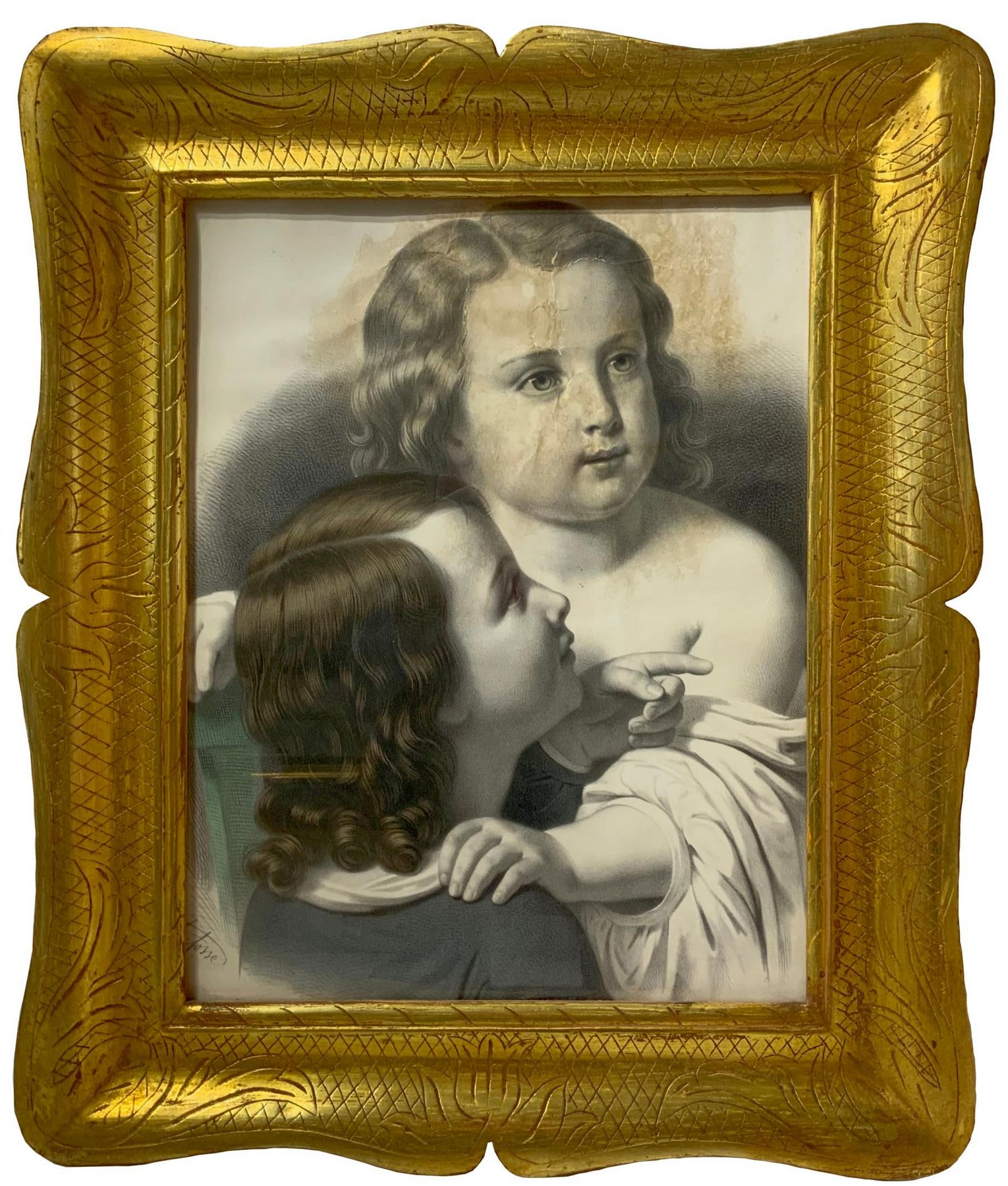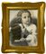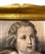Cornice in legno a vassoio dorata a mecca con gouache raffigurante due bambine. XX secolo. Cm 70x59 (misure esterne). Cm 50x38 (misure interne).