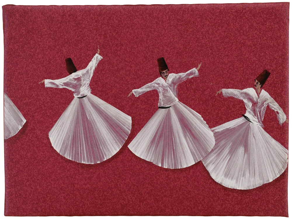 ALDO MONDINO Torino 04/10/1938 - 10/03/2005 Sufi, 1998 olio su linoleum cm. 60x80, firma, titolo e anno al retro, opera registrata presso l'Archivio Aldo Mondino come da certificato con foto allegato.