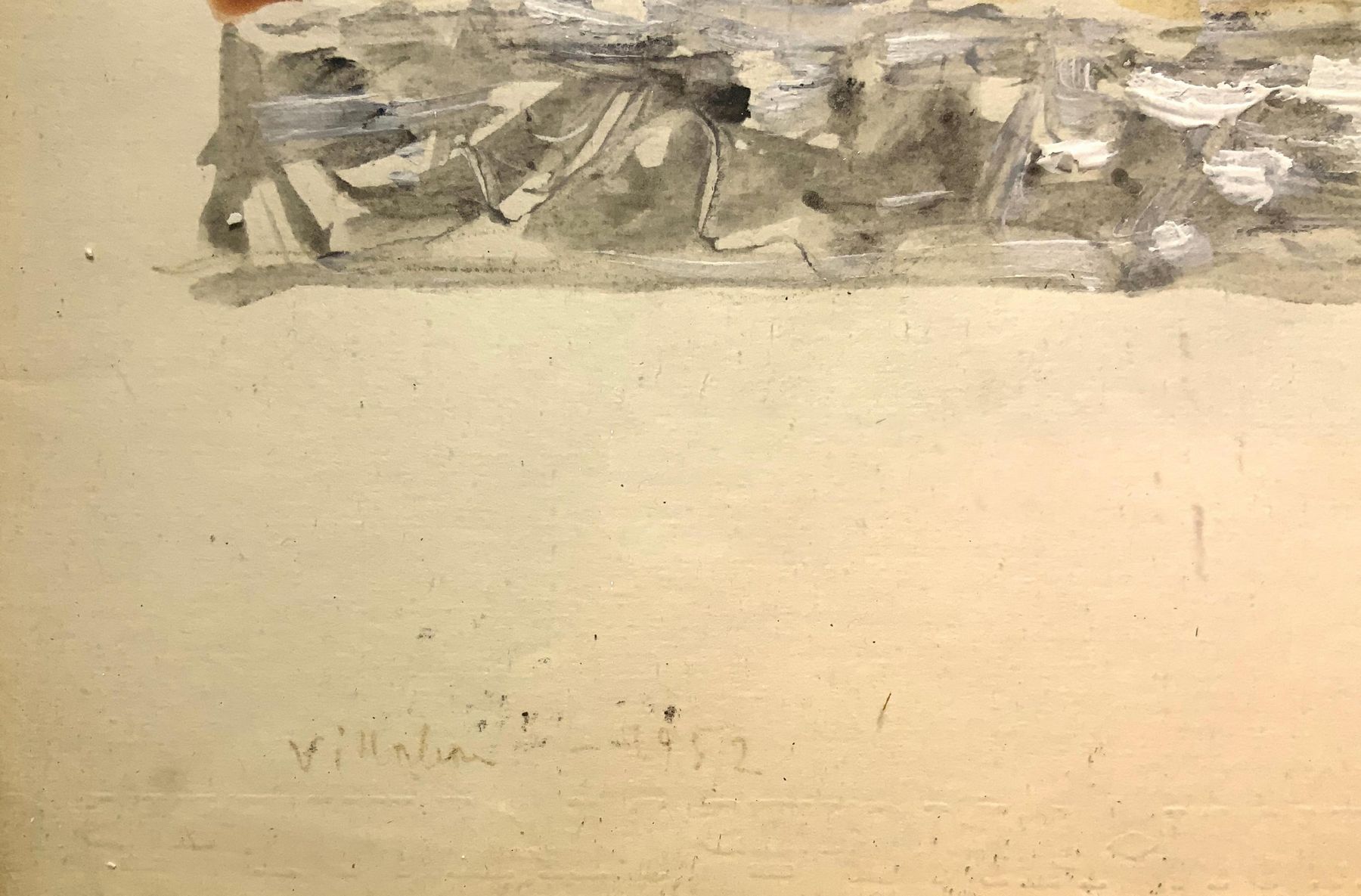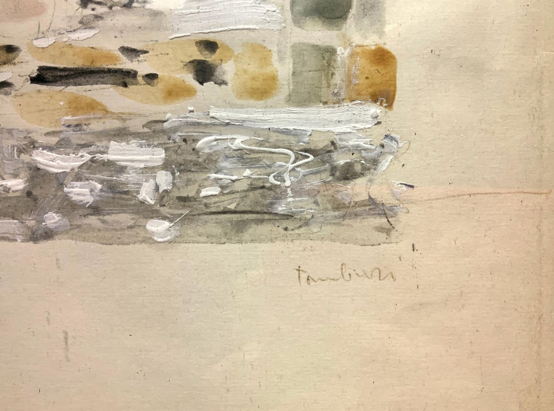 Dipinto a tecnica mista su carta raffigurante casa di Orfeo Tamburi (Jesi,1906- Parigi,1994). Cm 31,5x23,5. Firmato in basso a destra e datato 1952 in basso a sinistra. Pubblicato sul catalogo asta Finarte N° 1139 pag. 38.