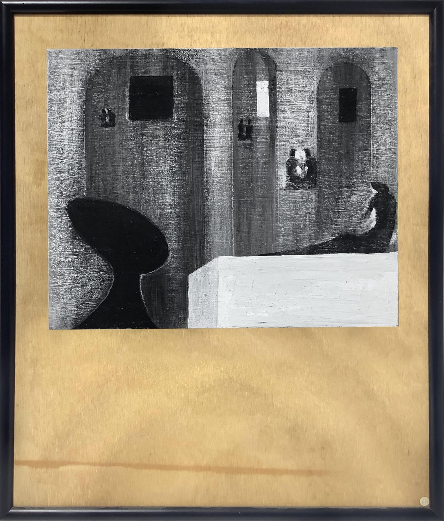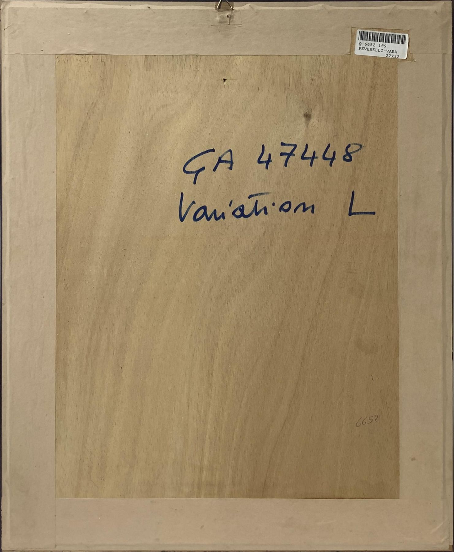 Olio applicato su tavola raffigurante Variation sur un theme de Saenredam, Cesare Peverelli (Milano 1922-Parigi 2000). Cm 27x3, in cornice 50x40, autentica su foto firmata dall’artista