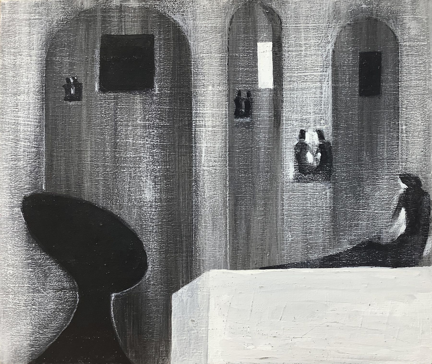 Olio applicato su tavola raffigurante Variation sur un theme de Saenredam,...