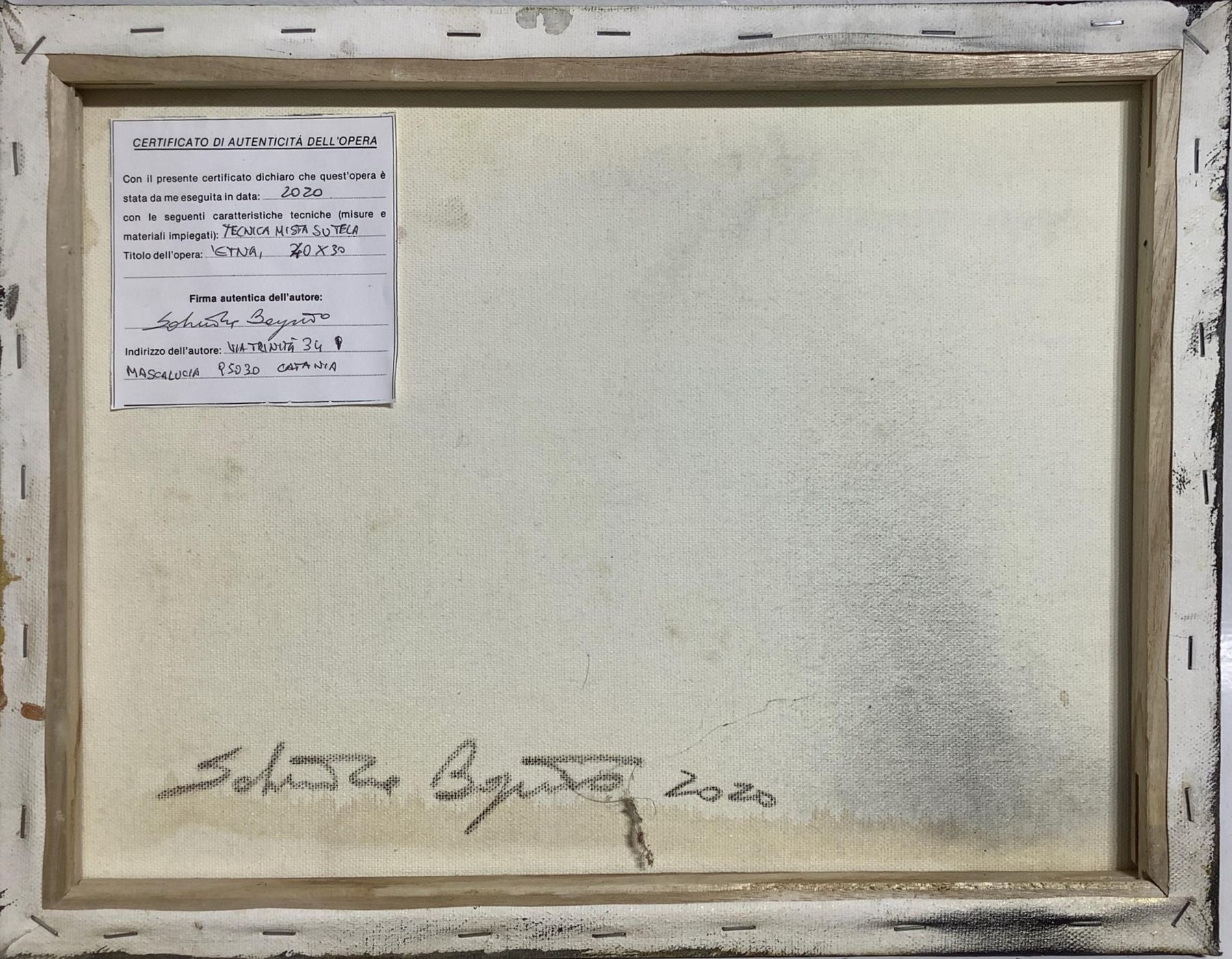 Dipinto a tecnica mista su tela raffigurante Etna, Salvatore Bonajuto (Catania1963). Cm 30x40. Firmato sul retro Salvatore Bonajuto 2020. Opera priva della cornice. Salvatore Bonajuto nasce a Catania nel 1963, alla fine degli anni Settanta, partecipa alle sue prime esposizioni collettive con lavori a carboncino e con opere pittoriche a partire dagli anni Ottanta. Negli anni Novanta vince un premio durante un'estemporanea di pittura organizzata dal Comune di Mascalucia (CT) ed una sua opera viene acquisita dal Comune stesso. Nel 2001 restaura e restituisce alla pubblica fruizione la Cappella Bonajuto, bizantina, ereditata dai suoi avi e di sua proprietà. Le sue pitture e i suoi acquerelli, che ritraggono suggestivi paesaggi di Sicilia o forme di espressionismo astratto, sono approdate negli USA, in molti paesi europei e una sua opera di grandi dimensioni é esposta nel padiglione di Cardiologia del policlinico di Catania. È in crescita il pubblico di estimatori che visitano la sua casa ed il suo Giardino d'arte a Mascalucia, dove lui vive e lavora. Quelli di Bonajuto sono scorci, paesaggi denotativi della dimensione soggettiva di una visione concreta e metaforica di grande valore espressivo. Ognuno degli elementi rappresentati, siano essi naturali o architettonici, sono monogrammi che racchiudono l’essenza di un vissuto estetico e psicologico che conducono il fruitore in quella dimensione onirica che consente di fuggire dal mondo pur abitandolo. L’uso di colori caldi è denotativo della volontà dell’artista di mostrarci l’oggetto per quello che è, sordamente illuminato dall’interno, bellissime le visioni dell’Etna che rendono l’idea della volontà di Bonajuto di dipingere la materia che si sta dando forma, in continuo cambiamento.