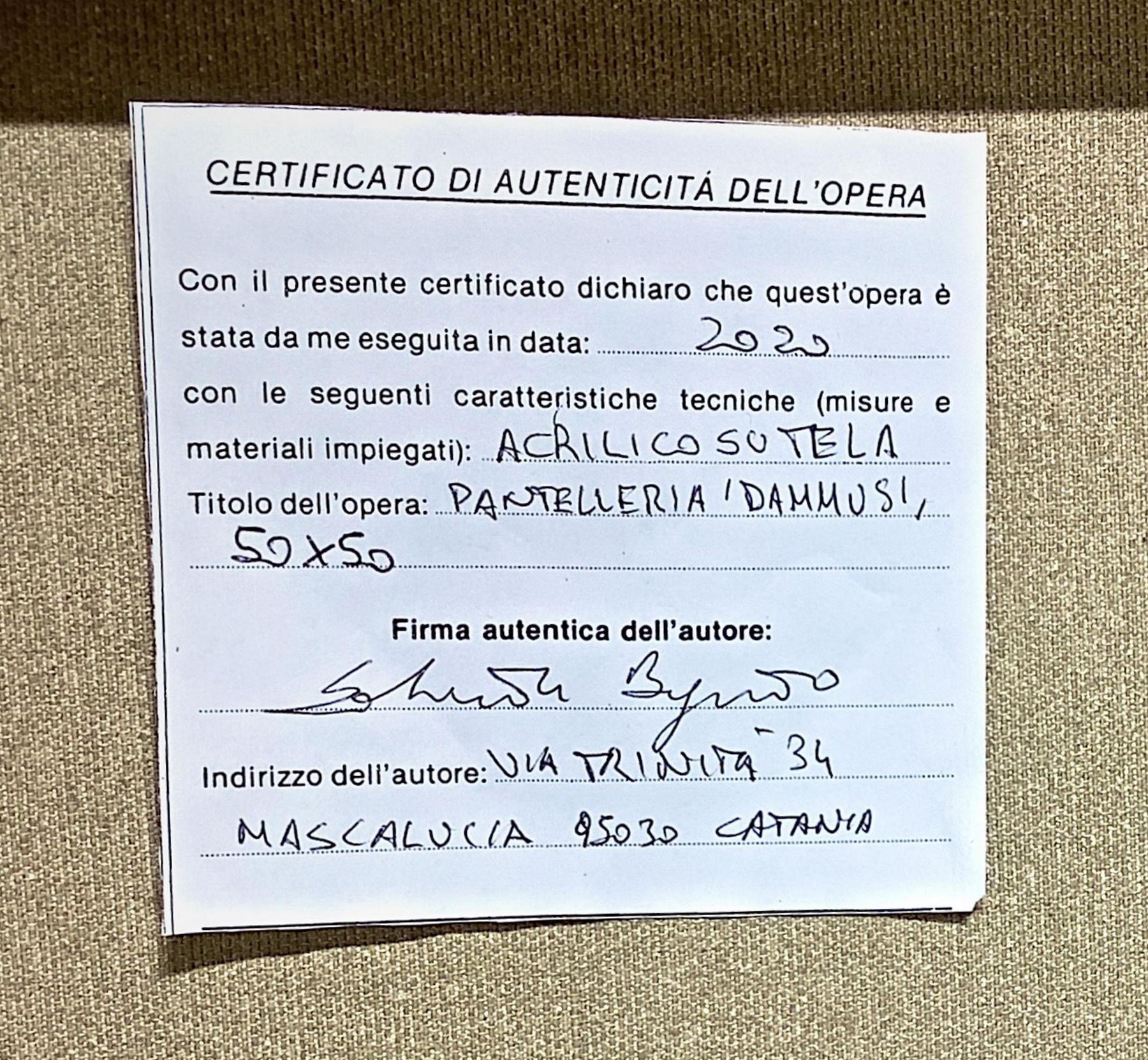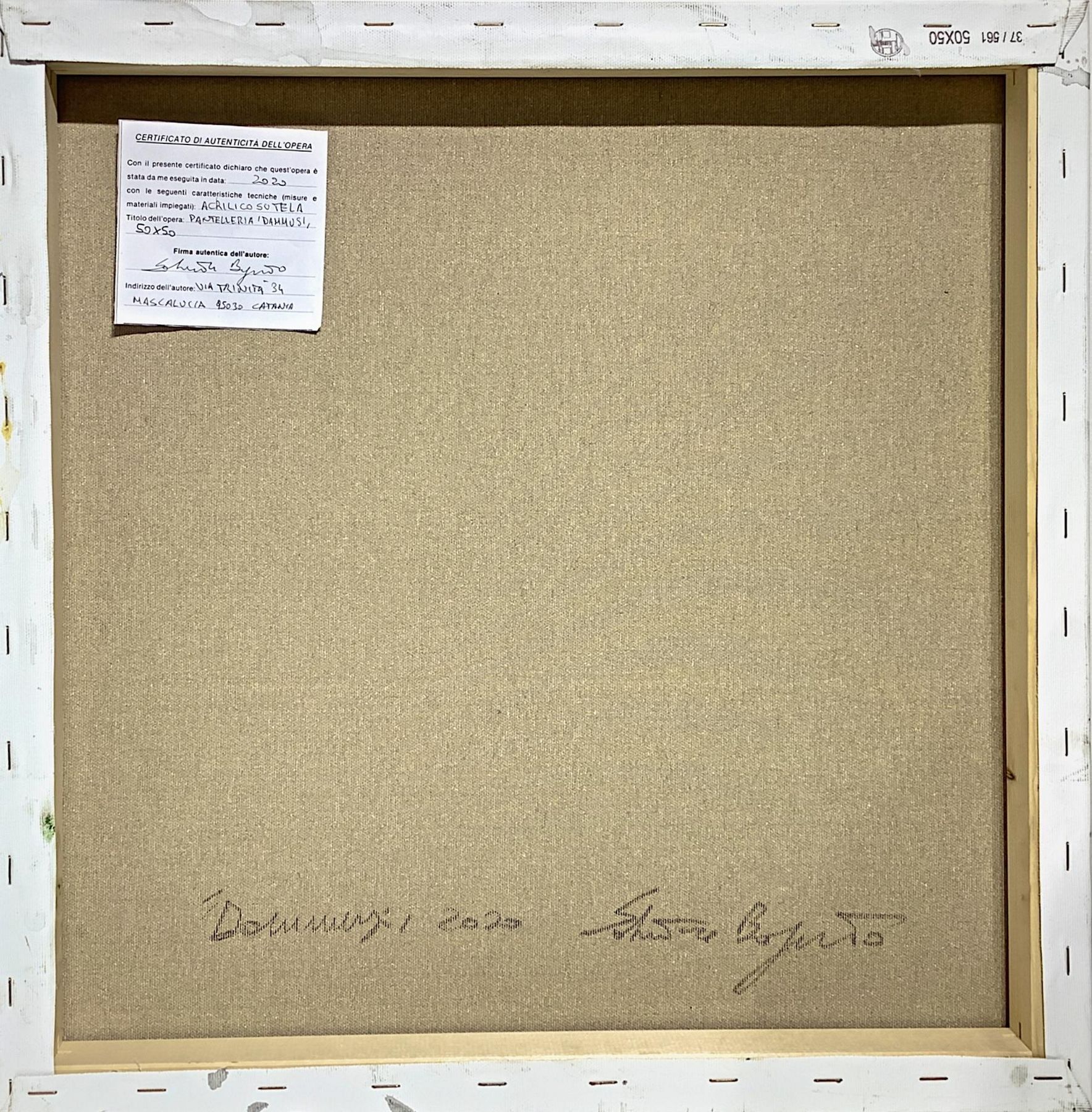 Dipinto ad acrilico su tela raffigurante i “Dammusi” di Pantelleria. Salvatore Bonajuto (Catania1963). Cm 50x50. Firmato sul retro Salvatore Bonajuto. Opera priva della cornice. Salvatore Bonajuto nasce a Catania nel 1963, alla fine degli anni Settanta, partecipa alle sue prime esposizioni collettive con lavori a carboncino e con opere pittoriche a partire dagli anni Ottanta. Negli anni Novanta vince un premio durante un'estemporanea di pittura organizzata dal Comune di Mascalucia (CT) ed una sua opera viene acquisita dal Comune stesso. Nel 2001 restaura e restituisce alla pubblica fruizione la Cappella Bonajuto, bizantina, ereditata dai suoi avi e di sua proprietà. Le sue pitture e i suoi acquerelli, che ritraggono suggestivi paesaggi di Sicilia o forme di espressionismo astratto, sono approdate negli USA, in molti paesi europei e una sua opera di grandi dimensioni é esposta nel padiglione di Cardiologia del policlinico di Catania. È in crescita il pubblico di estimatori che visitano la sua casa ed il suo Giardino d'arte a Mascalucia, dove lui vive e lavora. Quelli di Bonajuto sono scorci, paesaggi denotativi della dimensione soggettiva di una visione concreta e metaforica di grande valore espressivo. Ognuno degli elementi rappresentati, siano essi naturali o architettonici, sono monogrammi che racchiudono l’essenza di un vissuto estetico e psicologico che conducono il fruitore in quella dimensione onirica che consente di fuggire dal mondo pur abitandolo. L’uso di colori caldi è denotativo della volontà dell’artista di mostrarci l’oggetto per quello che è, sordamente illuminato dall’interno, bellissime le visioni dell’Etna che rendono l’idea della volontà di Bonajuto di dipingere la materia che si sta dando forma, in continuo cambiamento.