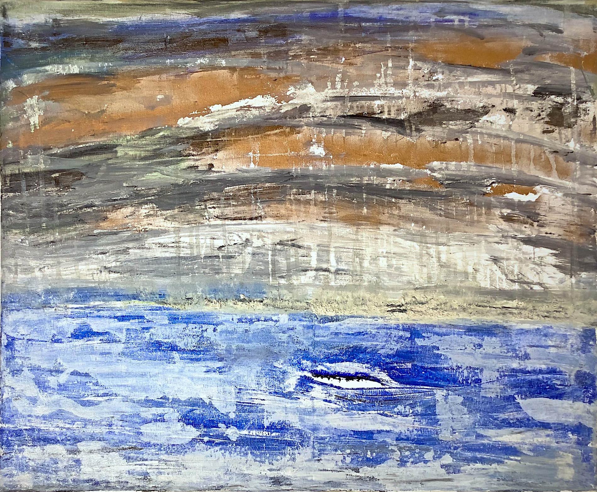 Dipinto a tecnica mista su tela raffigurante pioggia a mare a Pantelleria. Cm...