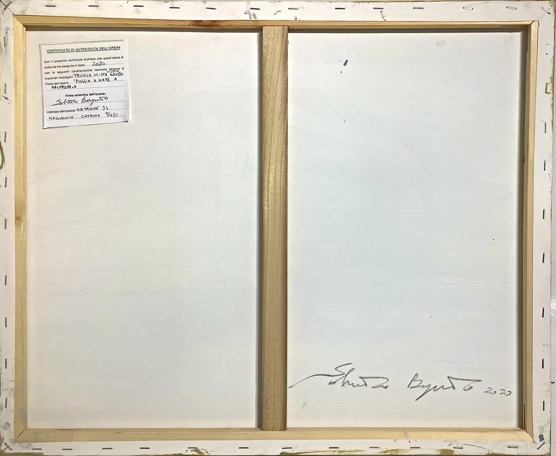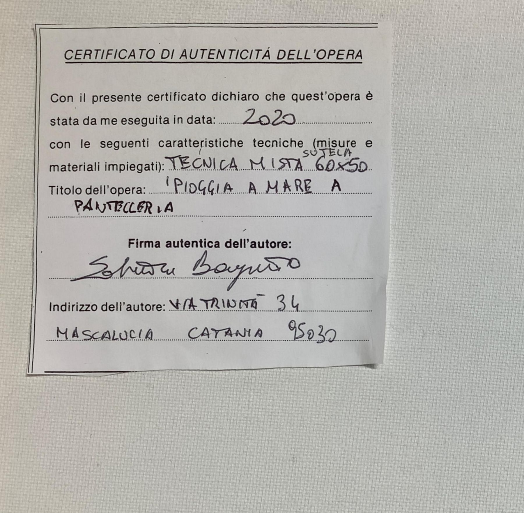 Dipinto a tecnica mista su tela raffigurante pioggia a mare a Pantelleria. Cm 60x50. Firmato sul retro Salvatore Bonajuto. Opera priva della cornice. Salvatore Bonajuto nasce a Catania nel 1963, alla fine degli anni Settanta, partecipa alle sue prime esposizioni collettive con lavori a carboncino e con opere pittoriche a partire dagli anni Ottanta. Negli anni Novanta vince un premio durante un'estemporanea di pittura organizzata dal Comune di Mascalucia (CT) ed una sua opera viene acquisita dal Comune stesso. Nel 2001 restaura e restituisce alla pubblica fruizione la Cappella Bonajuto, bizantina, ereditata dai suoi avi e di sua proprietà. Le sue pitture e i suoi acquerelli, che ritraggono suggestivi paesaggi di Sicilia o forme di espressionismo astratto, sono approdate negli USA, in molti paesi europei e una sua opera di grandi dimensioni é esposta nel padiglione di Cardiologia del policlinico di Catania. È in crescita il pubblico di estimatori che visitano la sua casa ed il suo Giardino d'arte a Mascalucia, dove lui vive e lavora.