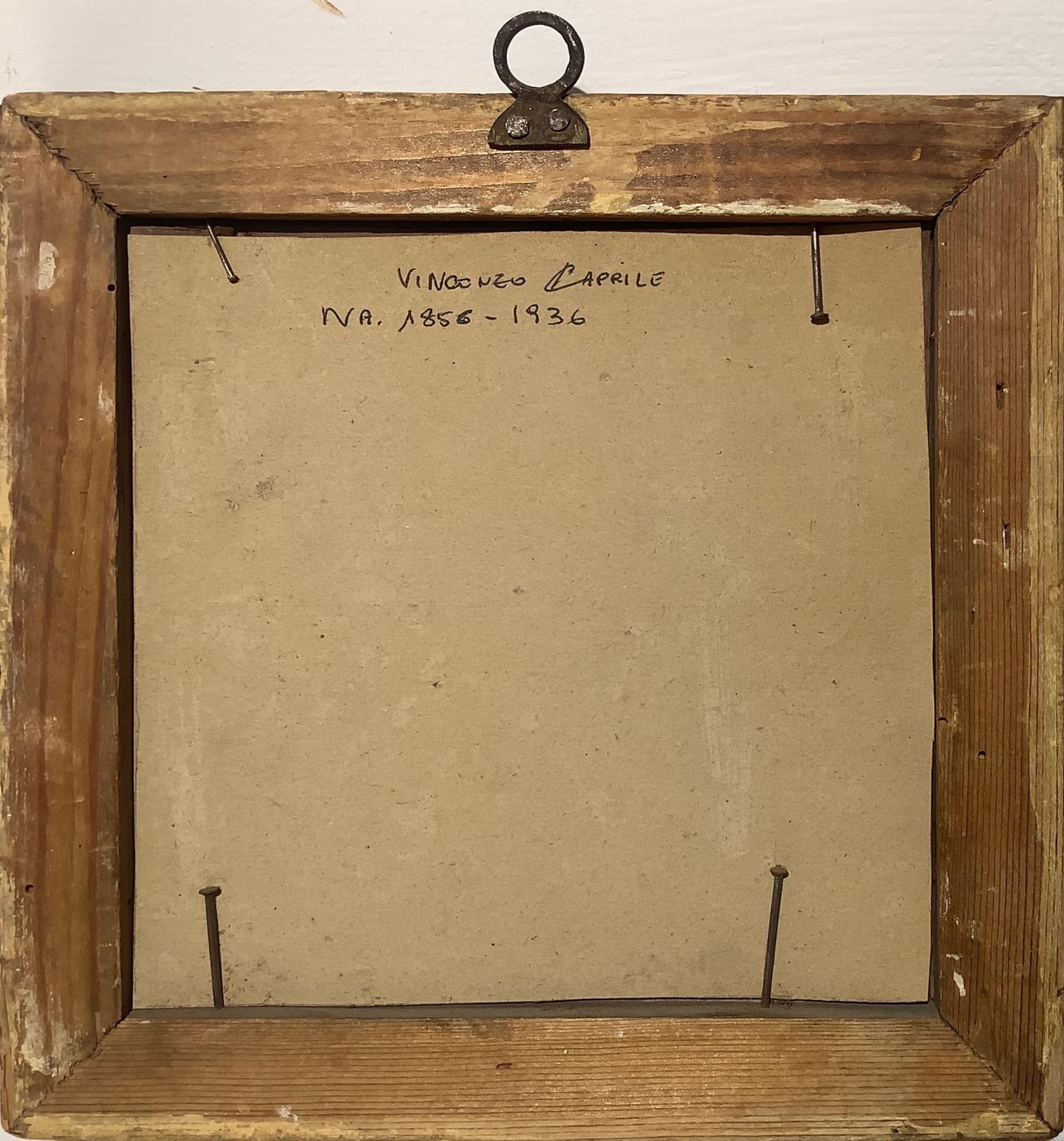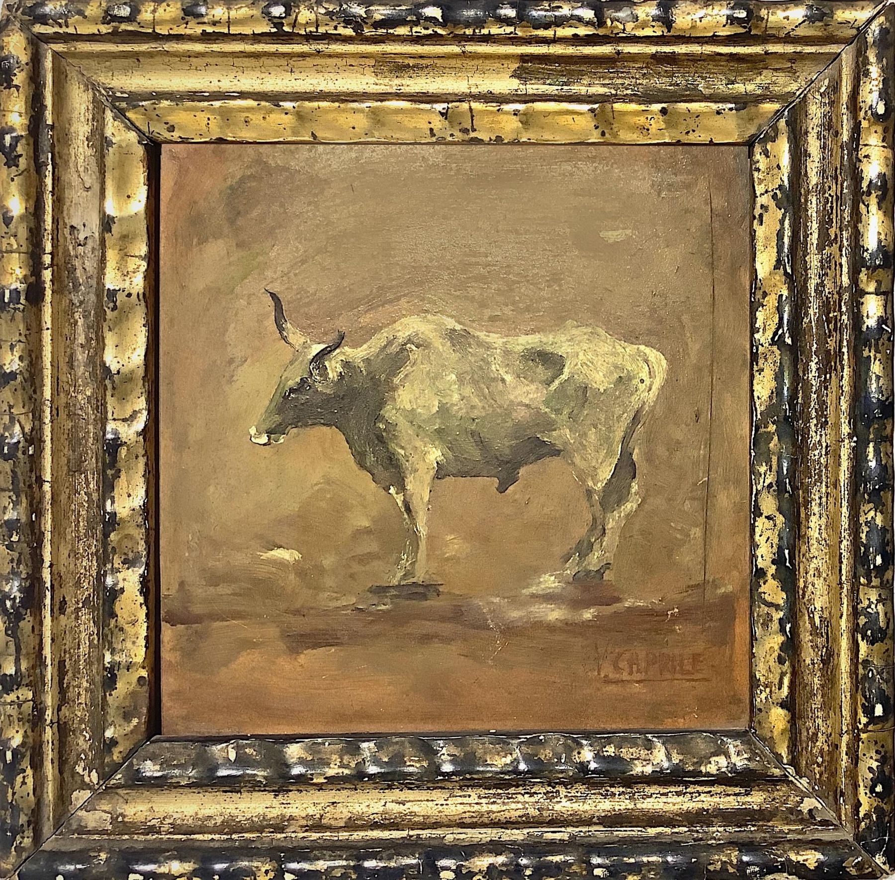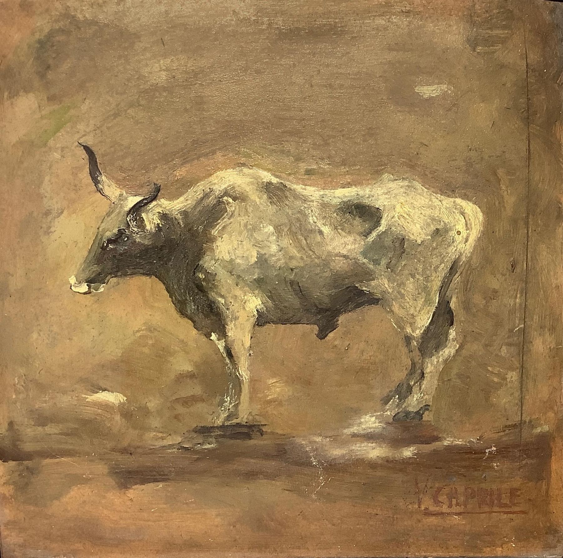 Dipinto ad olio su cartone raffigurante toro. Vincenzo Caprile (Napoli, 1856- Napoli, 1936). Cm 16x16. Firmato in basso a destra V. Caprile. Uno dei più noti rappresentanti del realismo della pittura italiana, dipinto ispirato alla tecniche del Palizzi.