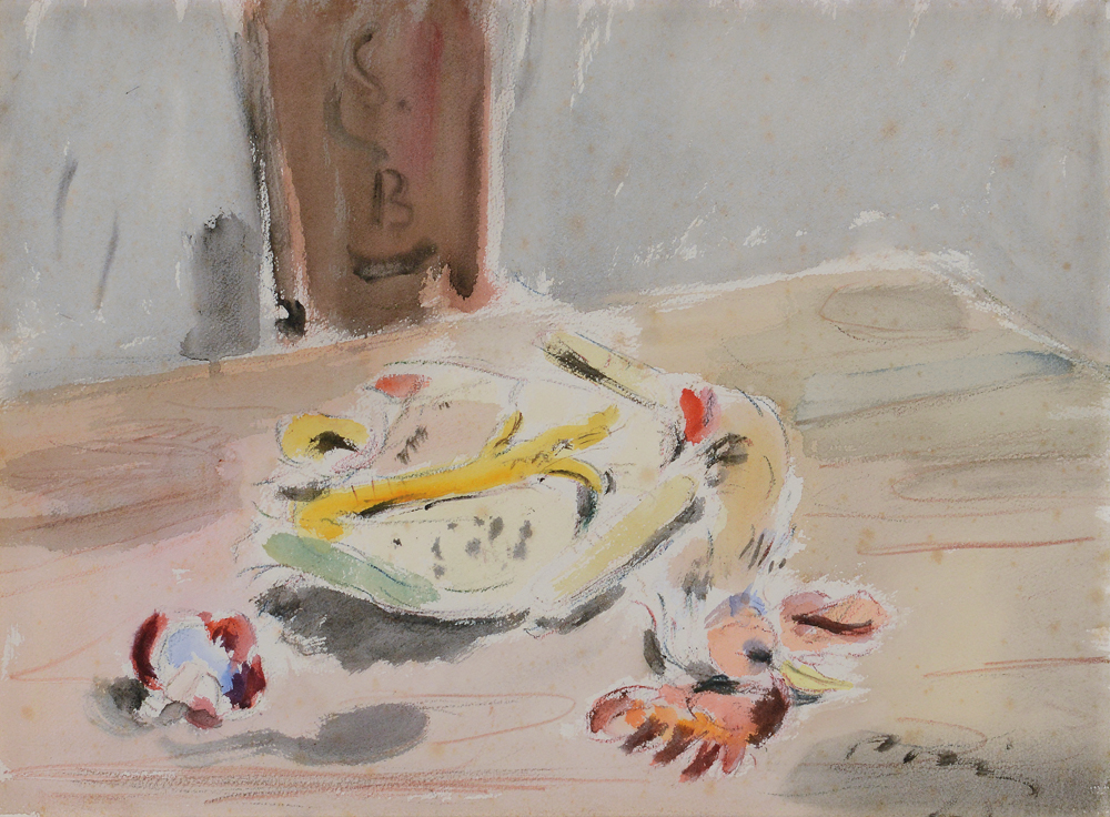 FILIPPO DE PISIS Ferrara 11/05/1896 - Milano 02/04/1956 Natura morta con gallo, 1944 acquerello e pastelli su carta applicata su cartone cm. 38x51, firma e anno in basso a destra, timbro della Galleria Hausammann (Cortina d'Ampezzo) al retro, opera registrata presso l'Archivio per il Catalogo dell'Opera di Filippo de Pisis come da dichiarazione su foto.