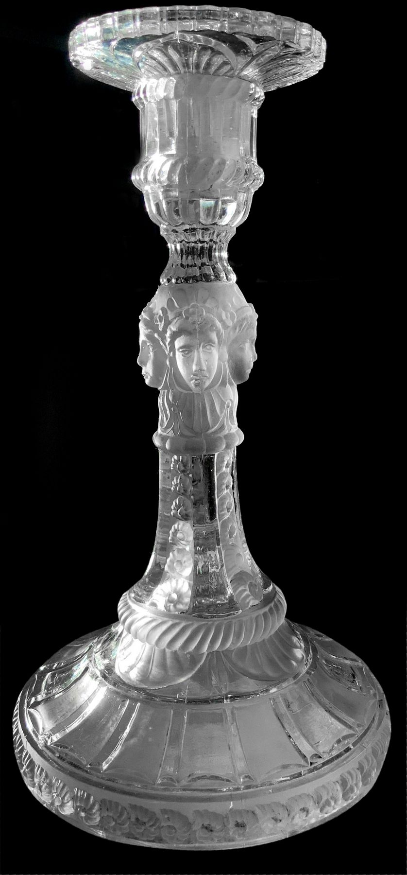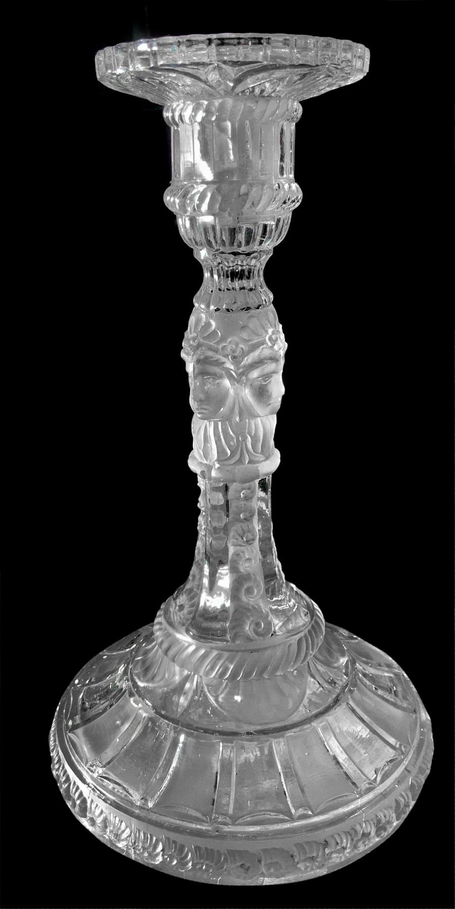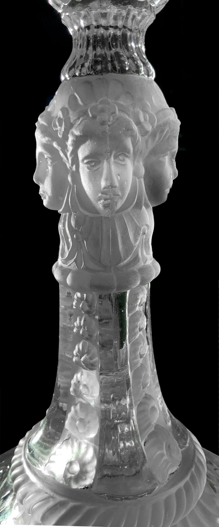 Lotto 213 | Candeliere monoforo in vetro trasparente bianco decorato con volti di donna,...