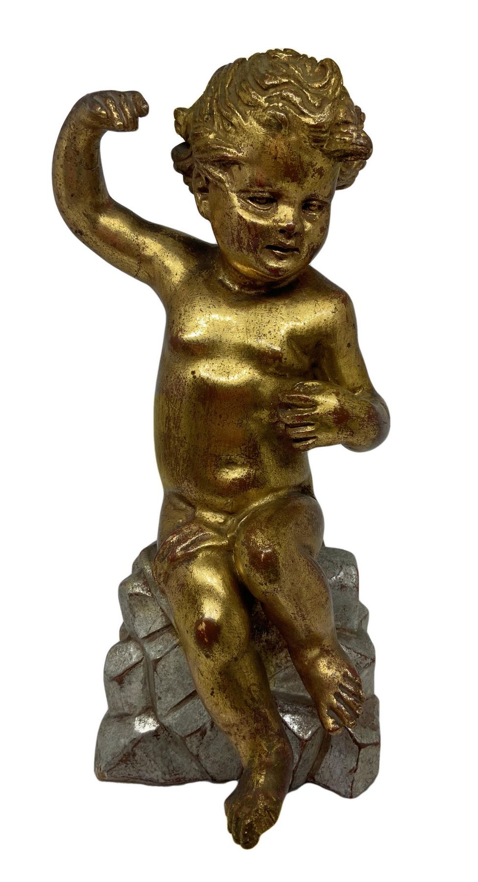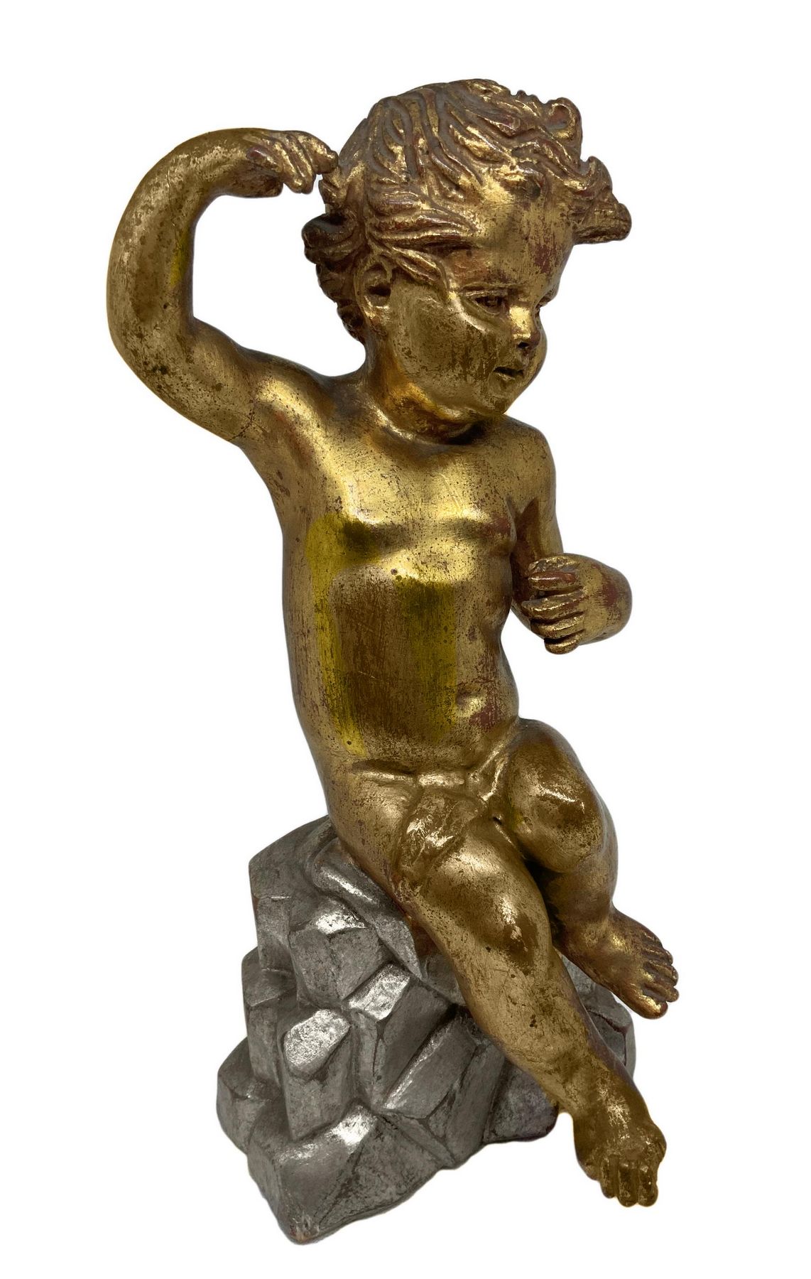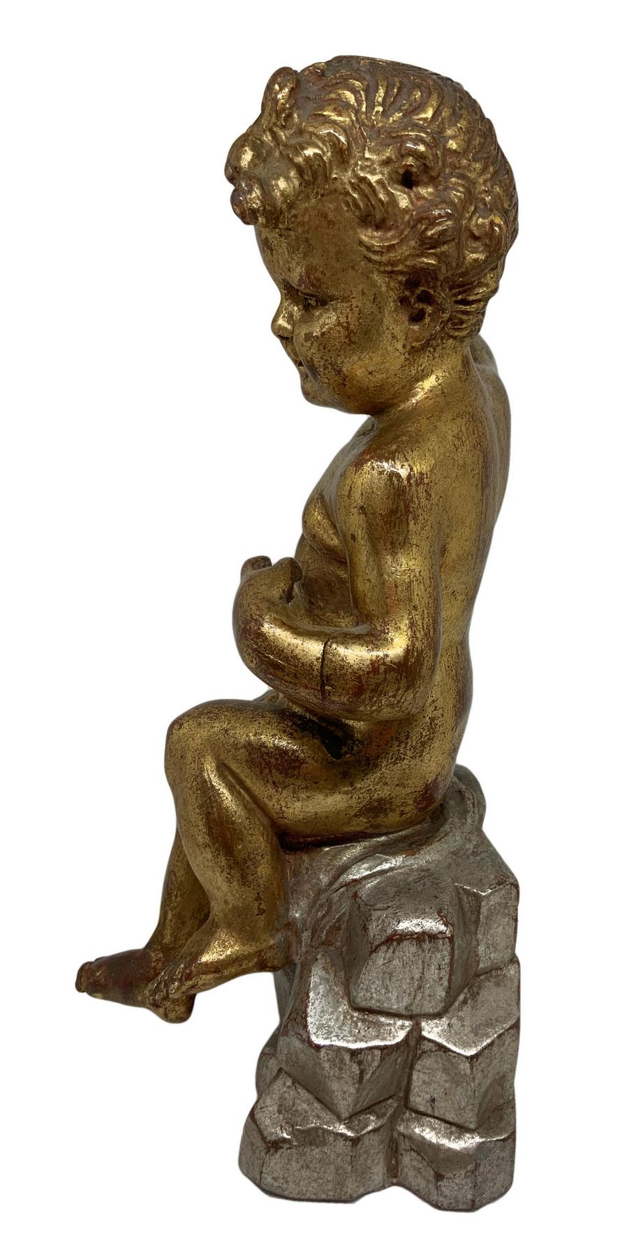Statua in legno dorato raffigurante puttino seduto su una base di legno argentato, inizi XX secolo. Doratura e argentatura a foglia. H cm 28.