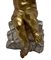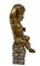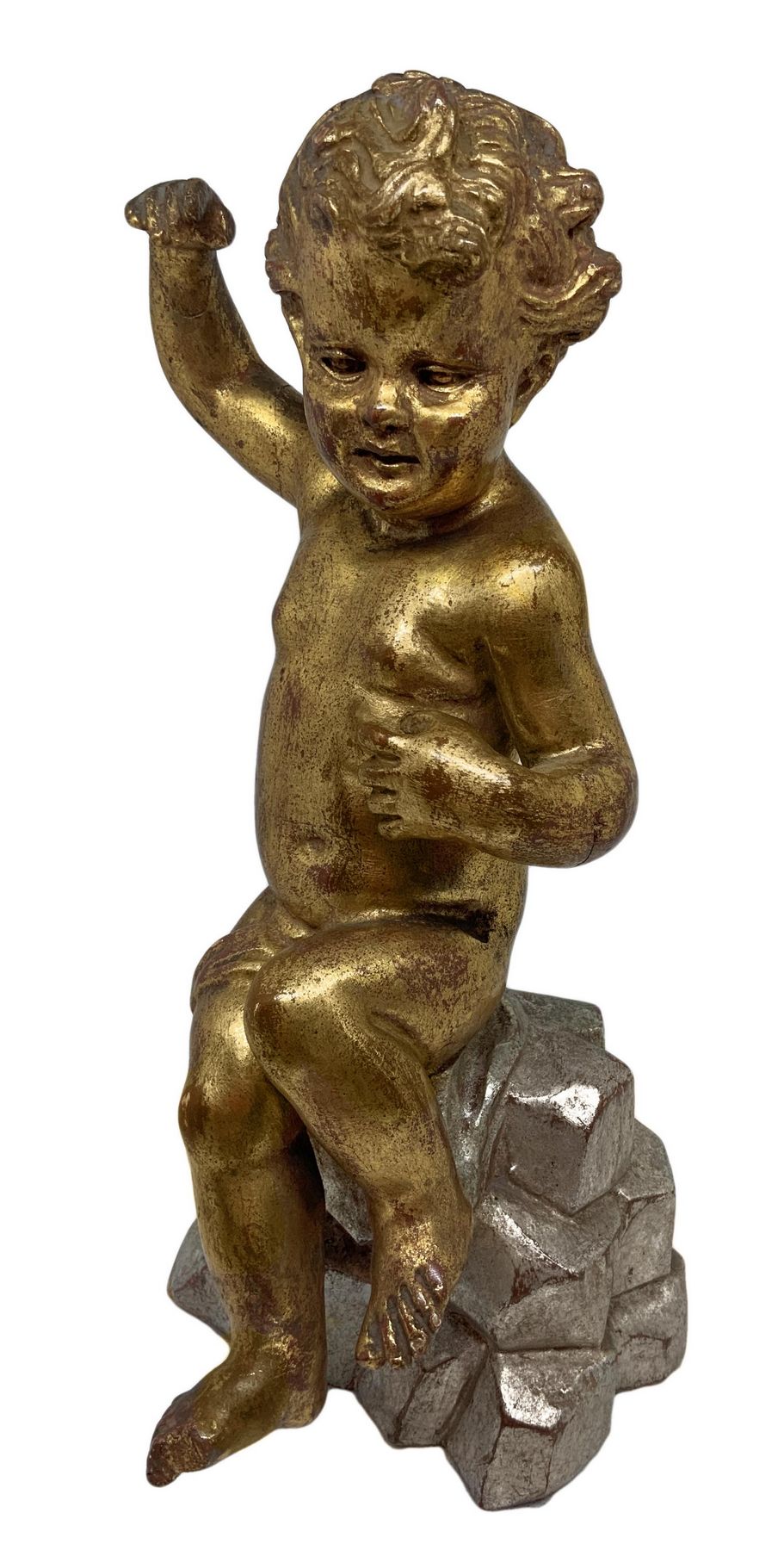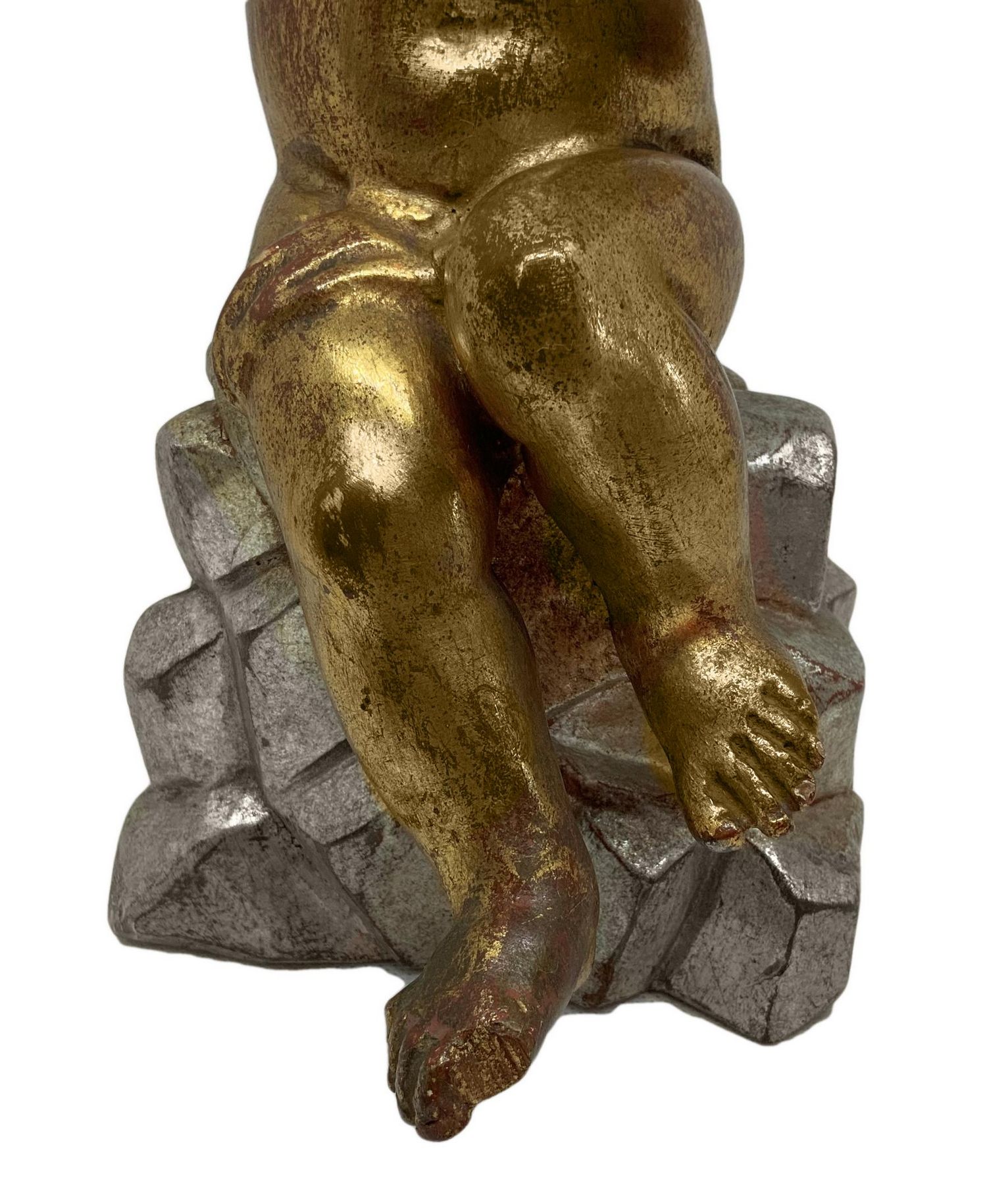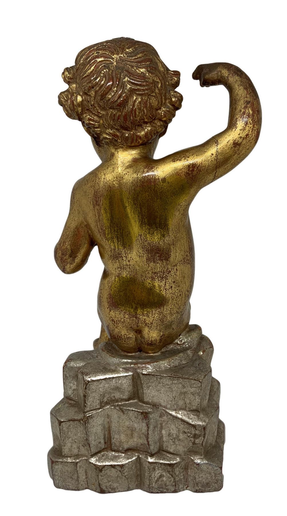 Statua in legno dorato raffigurante puttino seduto su una base di legno argentato, inizi XX secolo. Doratura e argentatura a foglia. H cm 28.