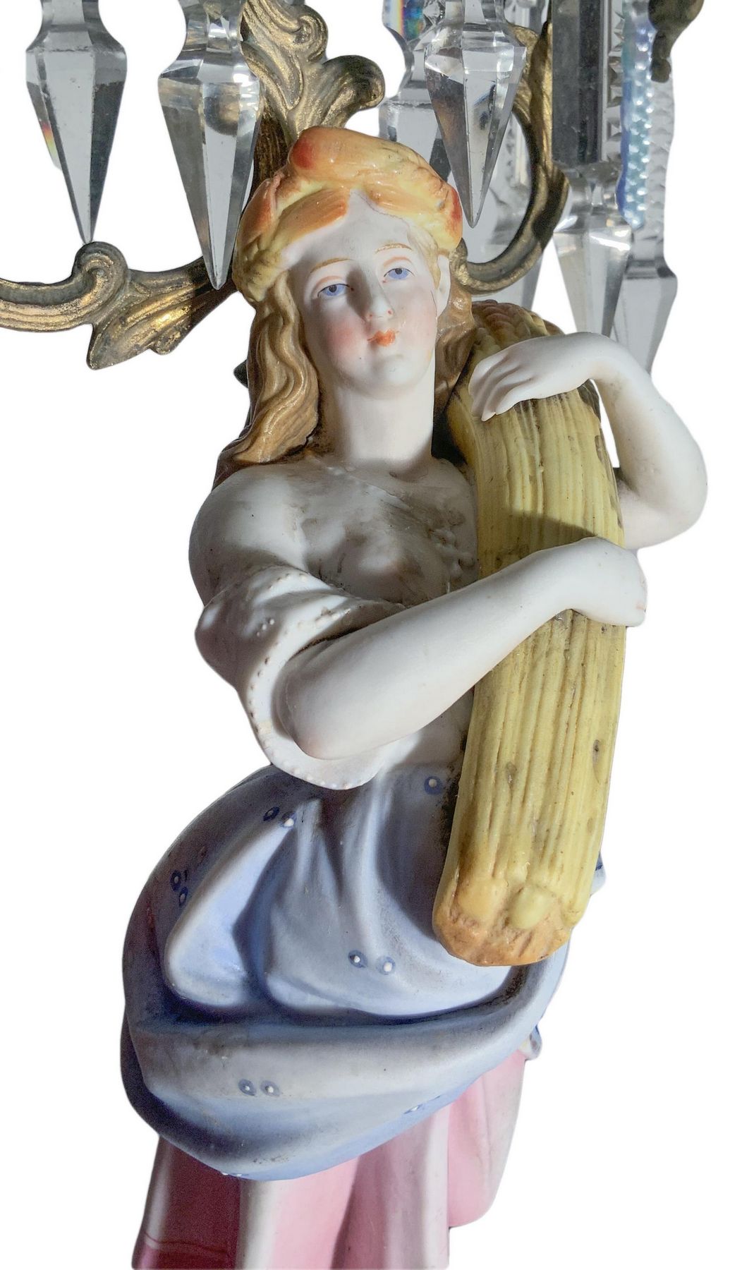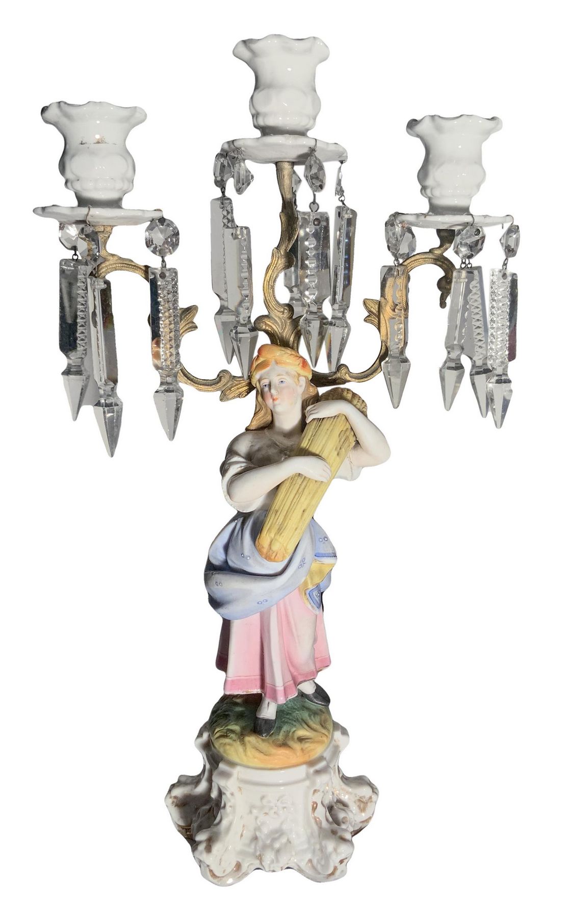 Coppia di candelieri in porcellana Biscuit a tre luci con brindoli in vetro molati a mano, Vecchia Francia, XIX secolo. H cm 40.