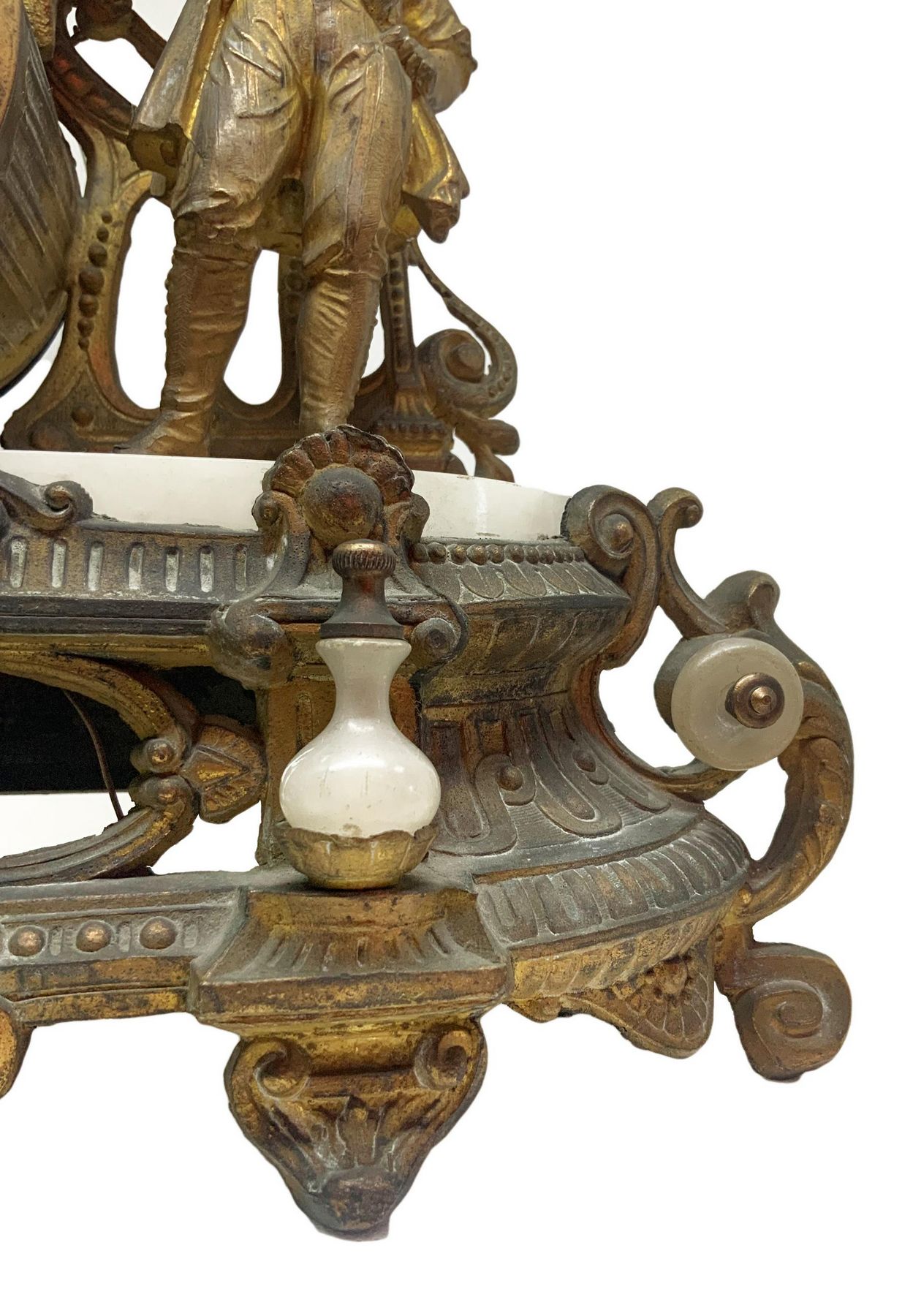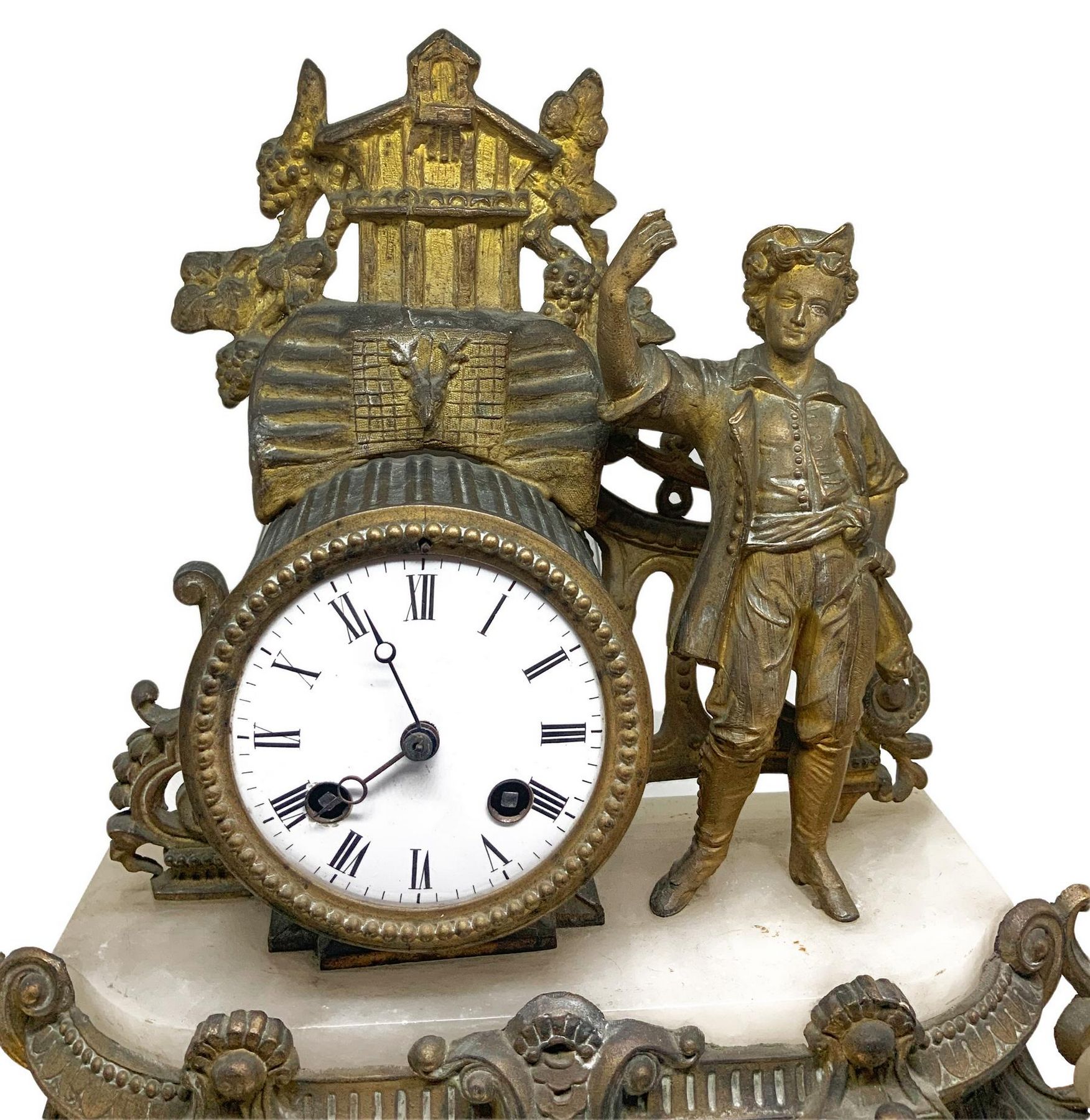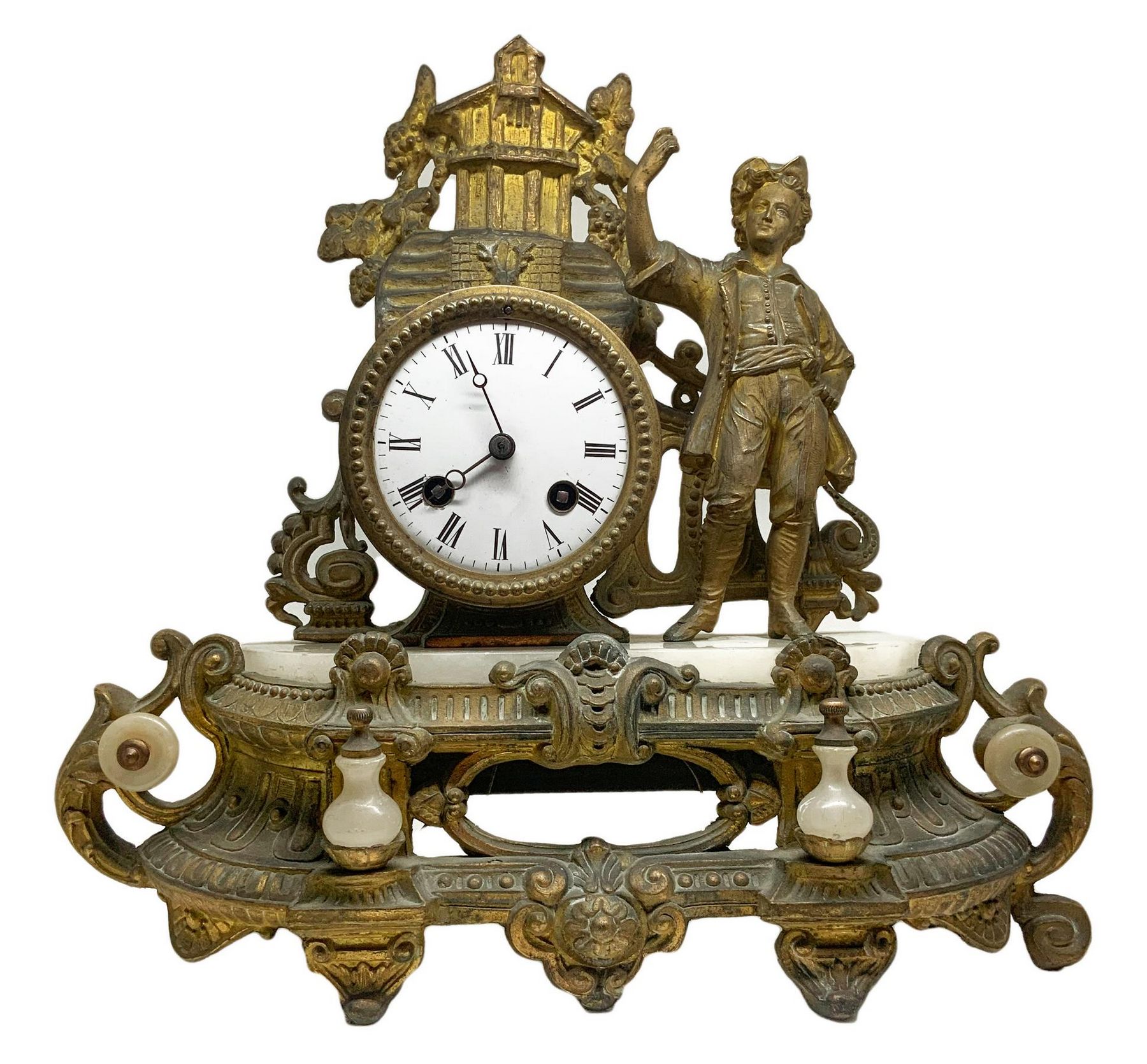 Orologio in bronzo raffigurante giovane ragazzo, con base in alabastro e quadrante in porcellana bianca, secolo XIX. H cm 31, base cm 34 x 10. Da revisionare